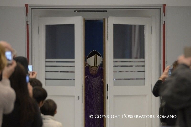 Ma kinyitjuk ezt a kaput, és két dolgot kérünk. Az első: az Úr nyissa meg szívünk kapuját, mindannyiunkét. Rászorulunk mindannyian, mert mindannyian bűnösök vagyunk. Mindannyian rászorulunk arra, hogy halljuk az Úr szavát, és hogy az Úr szava elérjen minket. A második: az Úr értesse meg velünk, hogy a gőg útja, a vagyon útja, a hiúság útja, az önteltség útja nem az üdvösség útja. Az Úr értesse meg velünk, hogy az ő atyai simogatása, az ő irgalma, megbocsátása akkor ér el minket, amikor a szenvedőkhöz, a társadalom kivetettjeihez közeledünk: ott van Jézus. Ez a kapu, mely a karitász kapuja, olyan kapu, ahol sok emberen, sok kidobott emberen segítenek, értesse meg velünk, mennyire szép lenne, ha mindannyian rómaiak, ha minden római kidobottnak érezné magát, és érezné, hogy rászorul Isten segítségére. Imádkozzunk ma Rómáért, minden római lakosért, mindenkiért, kezdve rajtam, hogy az Úr adja meg nekünk a kegyelmet, hogy kidobottnak érezzük magunkat! Mert nekünk semmi érdemünk sincs: egyedül ő lehet hozzánk irgalmas, egyedül ő adhat kegyelmet. És hogy közelebb kerüljünk ehhez a kegyelemhez, közelednünk kell a kidobottakhoz, a szegényekhez, a legkisemmizettebbekhez, mert e közeledésünk alapján ítéltetünk majd meg. Ma, amikor kinyitjuk ezt a kaput, adja meg az Úr ezt a kegyelmet egész Rómának, Róma minden lakosának, hogy tudjunk előrehaladni az irgalmasságnak abba az ölelésébe, ahol az Atya fogadja megsebzett fiát. Ám aki igazából sebeket hordoz, az az Atya: Istent megsebezte a szeretet, ezért képes mindnyájunkat megmenteni. Adja meg nekünk az Úr ezt a kegyelmet!