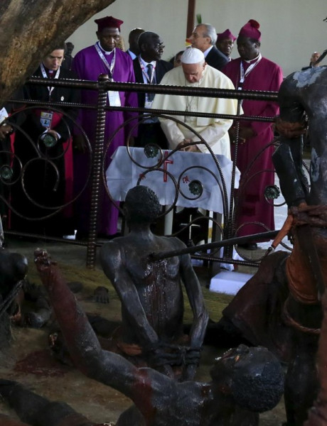 A Szentatya először az anglikán vértanúk kegyhelyén imádkozott, majd betért a közeli katolikus templomba, ahol a huszonkét katolikus vértanúra emlékezett. A modern templom a hagyományos helyi törzsi sátorra, huszonkét gerendája pedig annak sátorfájára emlékeztet, miközben utal a vértanúk számára is. A templom főoltára Lwanga Szent Károly ereklyéit őrzi, akit 1886. június 3-án öltek meg a hitéért. A vértanú az afrikai fehér atyák szavára tért meg, és mint a királyi testőrség parancsnoka külön büntetést kapott: elevenen égették el. Sírja halála óta zarándokhely, egyúttal az ország nemzeti szentélye. Az ugandai vértanúkat a II. vatikáni zsinat során VI. Pál pápa avatta szentté 1964. október 8-án.