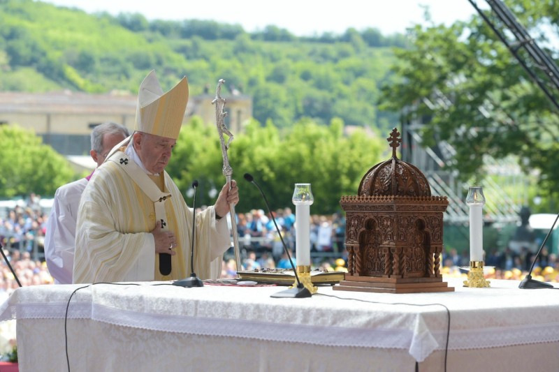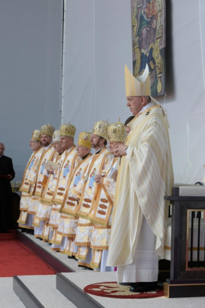 Ez a föld jól ismeri, mennyit szenvednek az emberek, amikor az ideológiának vagy egy rezsimnek a súlya erősebb az életnél, és önmagát normaként állítja az élet és az emberek hite elé; amikor a döntési képesség, a szabadság és a kreativitás tere leszűkül, sőt meg is szűnik (vö. Laudato si’ enciklika, 108). Fivéreim és nővéreim, ti elszenvedtétek azokat a kompromittáláson alapuló beszédeket és tetteket, amelyek odáig mentek, hogy kizárják és megsemmisítik azt, aki nem tudja megvédeni magát, és elhallgattatják a nem tetsző hangokat. Itt főleg arra a hét görögkatolikus püspökre gondolunk, akiket boldoggá avathattam. A rezsim kegyetlen elnyomásával szemben ők példás hitről és népük iránti szeretetről tettek tanúságot. Nagy bátorsággal és lelki erővel fogadták a kemény fogva tartást és a sokféle bántalmazást, és nem tagadták meg szeretett Egyházukhoz tartozásukat. Ezek a pásztorok, a hit vértanúi drága örökséget szereztek és hagytak a román népre, amelyet két szóban foglalhatunk össze: szabadság és irgalom.