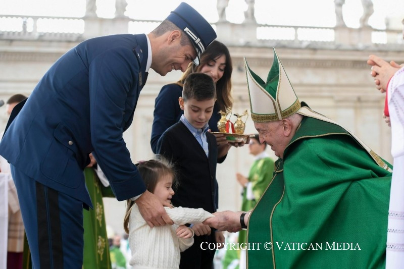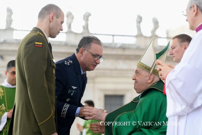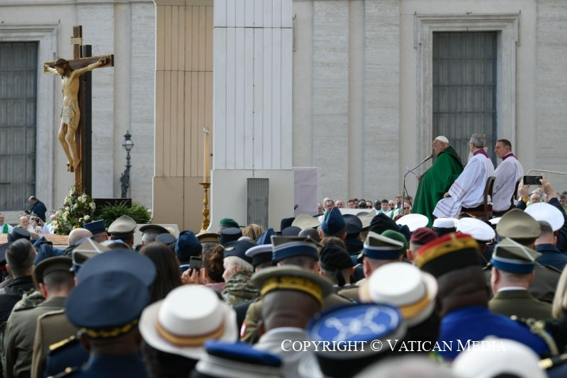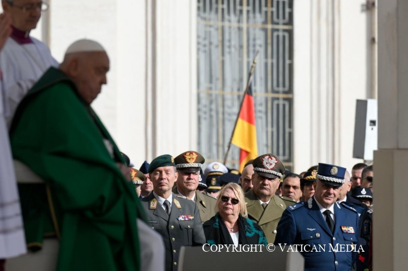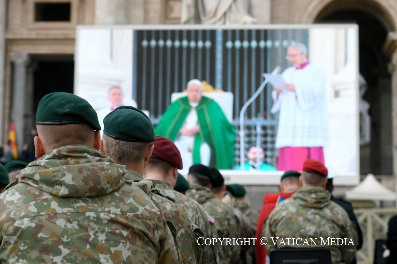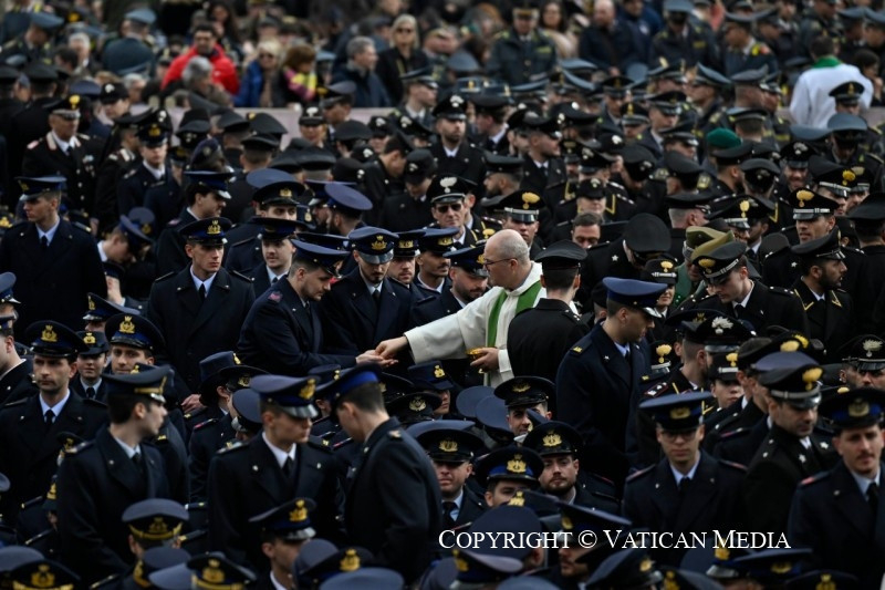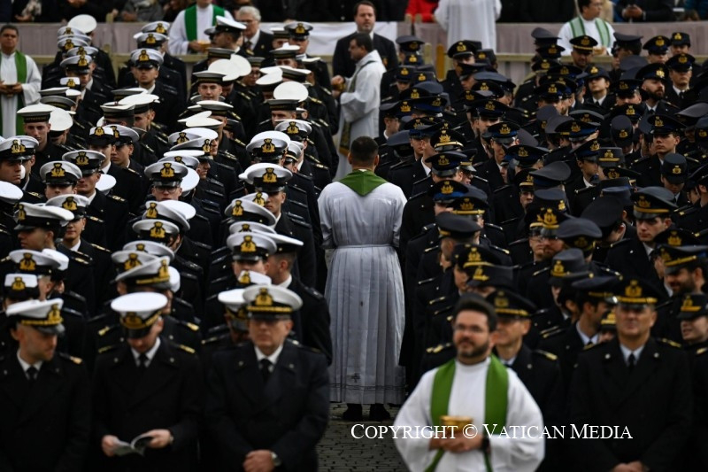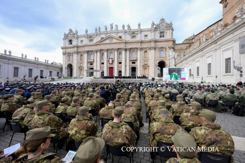 És ebben az egész életeteket átfogó feladatban a lelkészek is kísérnek benneteket, akik fontos papi jelenlétet jelentenek közöttetek. Ők nem arra szolgálnak – ahogyan az a történelemben néha sajnos megtörtént –, hogy megáldják a perverz háborús cselekedeteket. Nem! Ők Krisztus jelenléteként vannak köztetek, aki kísérni akar, hogy meghallgasson benneteket és közelséget nyújtson nektek, hogy bátorítson a nyílt vízre evezni, és hogy támogasson mindennapi küldetésetekben. Erkölcsi és lelki támaszként veletek együtt járják az utat, segítenek abban, hogy az evangélium fényében és a jó szolgálatában végezzétek feladatotokat.