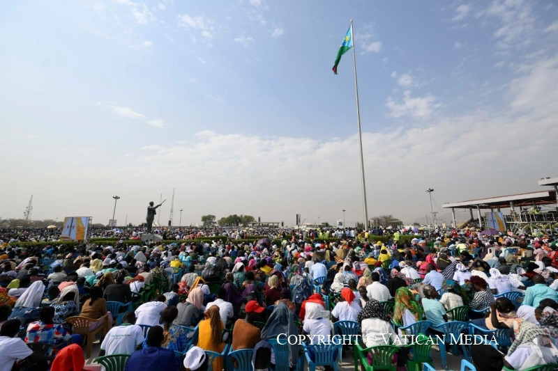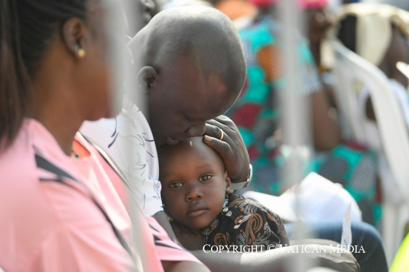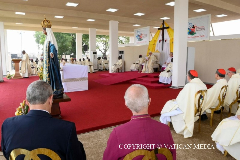 Szeretteim, kívánom, hogy legyetek só, mely nagylelkűen szétterül és elolvad, hogy az evangélium testvéri ízével ízesítse meg Dél-Szudánt; legyetek világító keresztény közösségek, amelyek, mint magasan épült városok, mindenkire jó fényt vetnek, és megmutatják, hogy jó és lehetséges megélni az ingyenességet, táplálni a reményt, mindnyájan együtt építeni a kiengesztelődött jövőt. Testvéreim és nővéreim, veletek vagyok, és kívánom, hogy tapasztaljátok meg az evangélium örömét, azt az ízt és világosságot, amelyet az Úr, „a békesség Istene” (Fil 4,9), „minden vigasztalás Istene” (2Kor 1,3), mindnyájatoknak meg kíván adni.