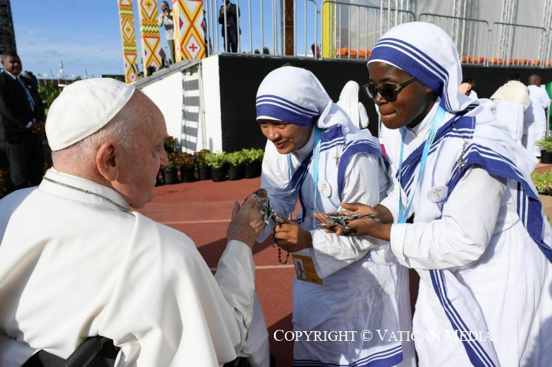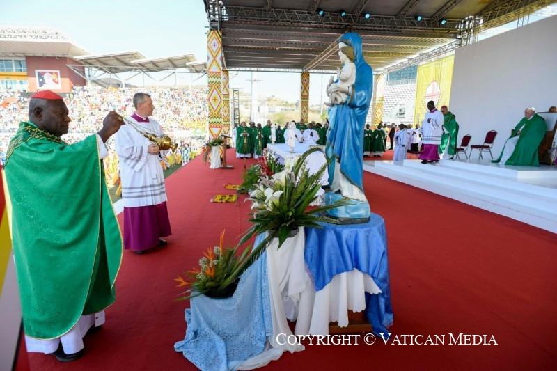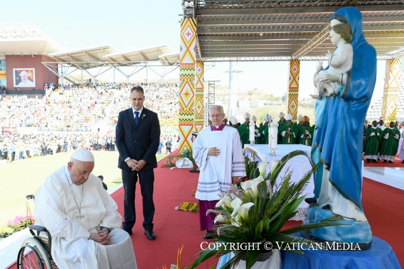 Mielőtt befejeznénk ezt a szentmisét, forduljunk az Úrangyala imával Szűz Máriához! Rá bízom a Pápua Új-Guineában és a Salamon-szigeteken élő Egyház útját. Mária, a Keresztények Segítsége – Maria Helpim – kísérjen és oltalmazzon benneteket szüntelenül: erősítse a családok egységét, tegye széppé és bátorrá a fiatalok álmait, támogassa és vigasztalja az időseket, erősítse meg a betegeket és szenvedőket!