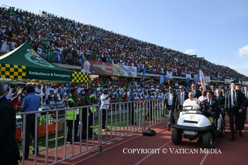 Szeptember 8-án reggel a Szentatya a Port Moresby-i Sir John Guise Stadionban mutatott be angol nyelvű szentmisét az évközi XXIII. vasárnapon. A mise végén, John Ribat bíborosnak, a város érsekének beszéde után a Szentatya a vasárnap szokásos Mária-imádságot, az Úrangyalát imádkozta el a hívőkkel.