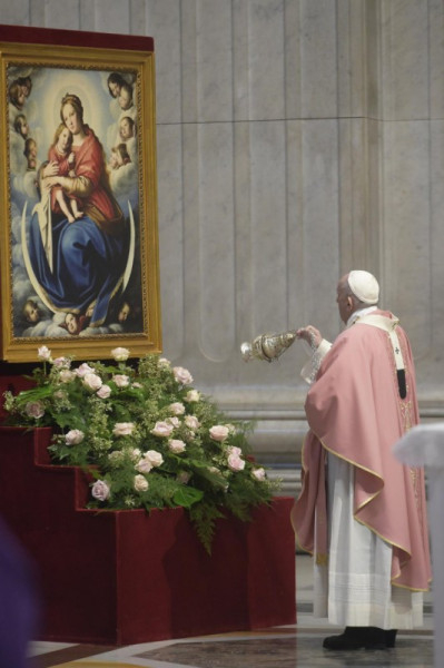 És ez az öröm forrása! Isten annyira szerette a világot, hogy odaadta Fiát. Innen nyeri értelmét az a felhívás, amelyet az Egyház a mai vasárnapon hozzánk intéz: „Örvendezz […]! Ujjongjatok és örüljetek, akik azelőtt szomorkodtatok: teljetek el vigasztalástok bőségével” (kezdőének; vö. Iz 66,10–11). Visszagondolok arra, amit egy héttel ezelőtt tapasztaltunk Irakban: egy meggyötört nép ujjongva örült; hála Istennek, az ő irgalmának! Időnként ott keresünk örömet, ahol nincs, a hiú ábrándokban, önmagunk nagynak képzelésében, az anyagi dolgok látszólagos biztonságában, önmagunkról alkotott képünk kultuszában és sok minden másban… De az élet tapasztalata arra tanít bennünket, hogy az igazi öröm az az érzés, hogy ingyenesen szeretve vagyunk, hogy kísérve vagyunk, hogy van valaki, aki osztozik álmainkon, és aki, ha hajótörést szenvedünk, segítségünkre siet, és biztonságos kikötőbe vezet bennünket.