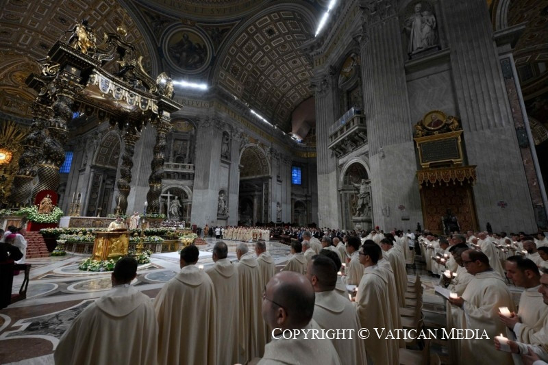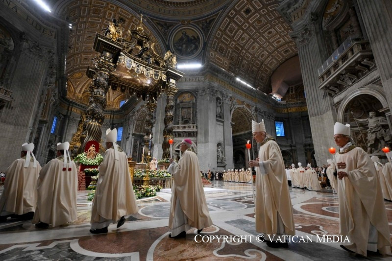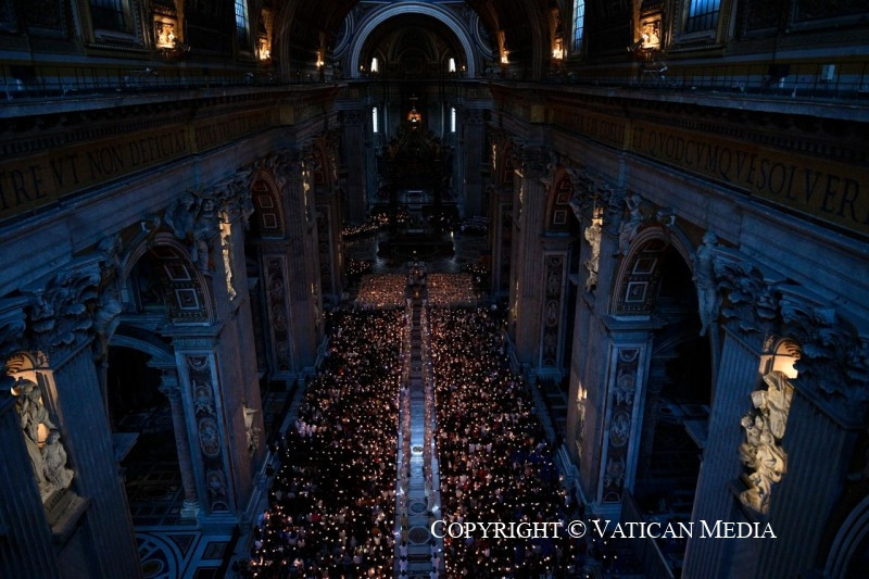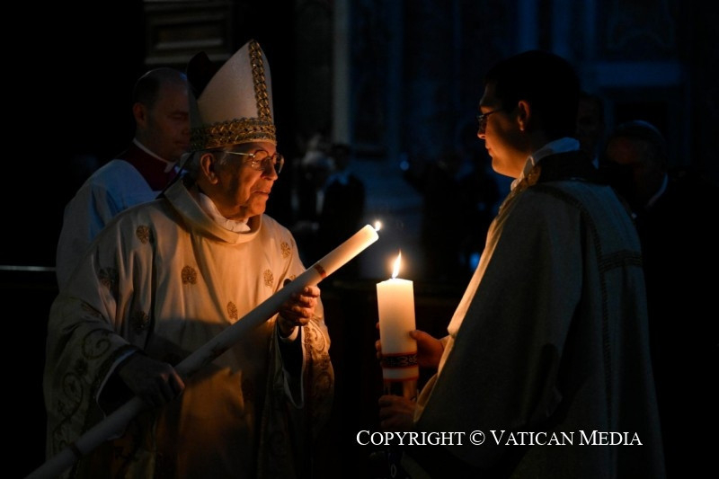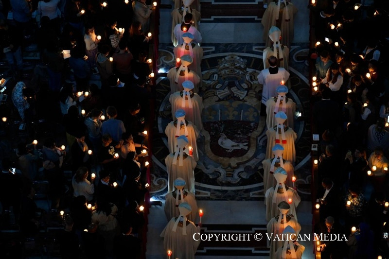 Így a húsvéti vigília arra emlékeztet bennünket, hogy a feltámadás fénye lépésről lépésre világítja meg az utat, zaj nélkül tör be a történelem sötétségébe, gyengéden világít be szívünkbe.