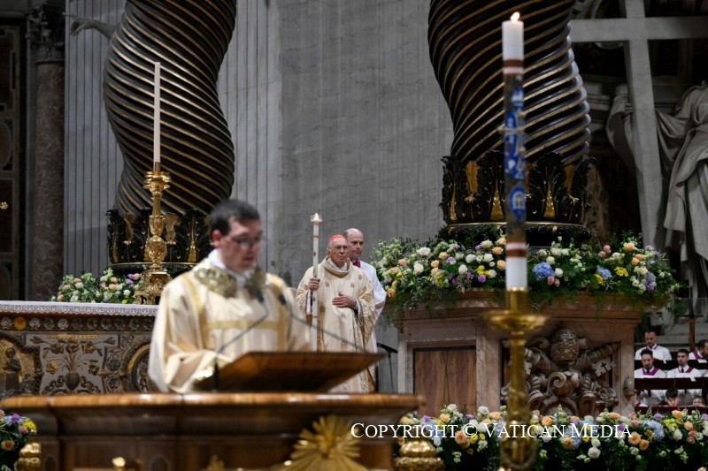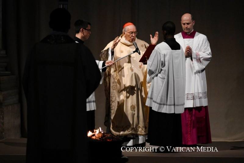 A liturgia a bazilika átriumában kezdődött a tűz megáldásával és a húsvéti gyertya előkészítésével. Az oltárhoz vezető körmenetet, a húsvéti gyertya meggyújtását és az Exsultet eléneklését az igeliturgia és a keresztelés liturgiája követte, melynek során a Re bíboros három újonnan megtért hívőnek szolgáltatta ki a beavató szentségeket.
