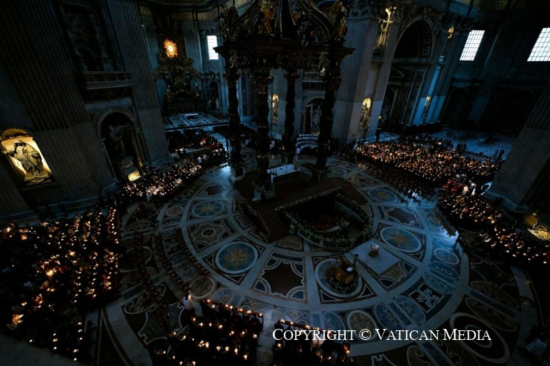 Az éjszaka vége felé történnek az imént meghirdetett evangéliumban elbeszélt események (vö. Lk 24,1–12): a feltámadás isteni fénye akkor gyullad fel és az Úr húsvéti átmenetele akkor megy végbe, amikor a nap még felkelőben van; a hajnal derengésénél látjuk, hogy a Jézus sírjára helyezett nagy követ elhengerítették, és gyászfátyolt viselő asszonyok érkeznek arra a helyre. Sötétség veszi körül a tanítványok zavarát és félelmét. Minden az éjszaka folyamán történik.