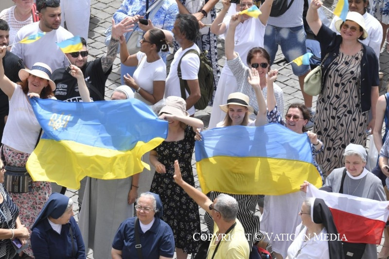 Ne feledkezzünk meg a meggyötört ukrán népről sem, mely a leginkább szenved és a legjobban vágyik a békére. Köszöntöm ezt a zászlót tartó ukrán csoportot. Közel vagyunk hozzátok!