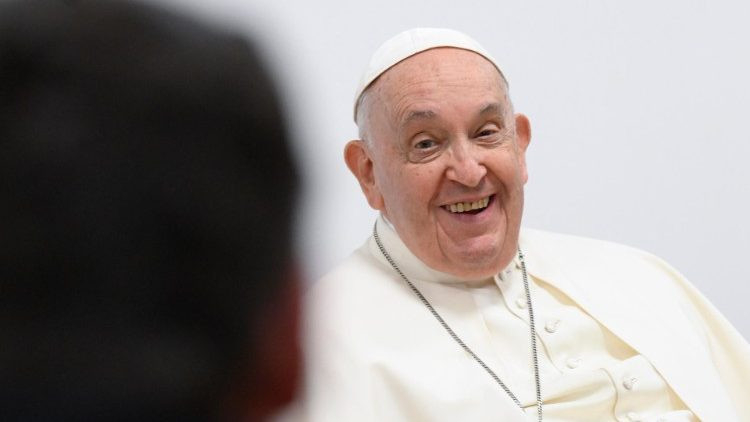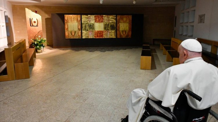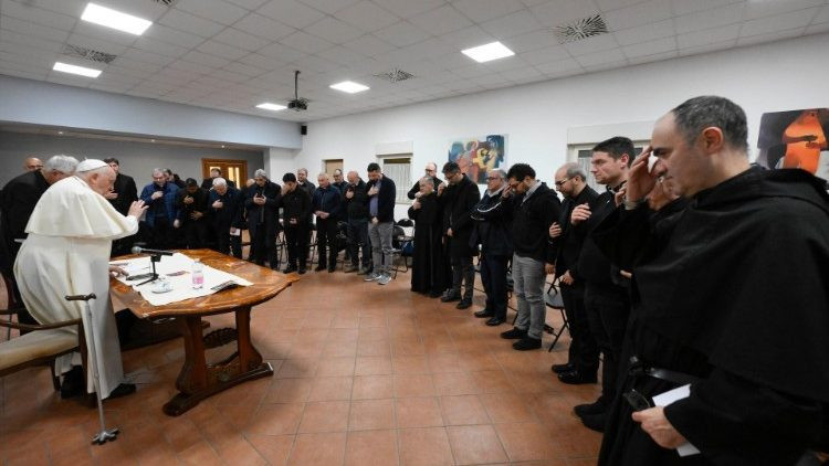 A pápa a kápolnában csöndes imába mélyedt. Elfogadott egy kávét, majd a papokkal együtt elmondta a Szentlélekhez szóló imát, amit a 2023/24-es lelkipásztori évre választottak az egyházmegyében. Ezt követte a beszélgetés Róma püspöke és papjai között, mely során a pápa szorgalmasan jegyzetelte a kérdéseket, és sorra megválaszolta őket.