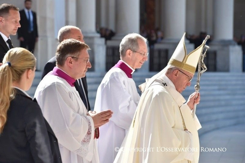 Kedves zarándokok, van anyánk, van anyánk! Gyermekként Máriába kapaszkodva abból a reményből élünk, amely Jézusra támaszkodik, mert, miként a szentleckében hallottuk: „azok, akik a kegyelem és megigazulás bőséges ajándékát kapják, uralkodni fognak az életben az egy Jézus Krisztus által” (Róm 5,17). Amikor Jézus mennybe ment, elvitte a mennyei Atyához az emberi természetet – a mi emberiségünket –, amelyet magára vett Szűz Mária méhében, és soha többé nem válik meg tőle. Vessük reményünket horgonyként abba a mennyben, az Atya jobbján elhelyezkedő emberségbe (vö. Ef 2,6)! Ez a remény legyen mindnyájunk életének támasza: az a remény, amely mindig támogat minket, utolsó leheletünkig.