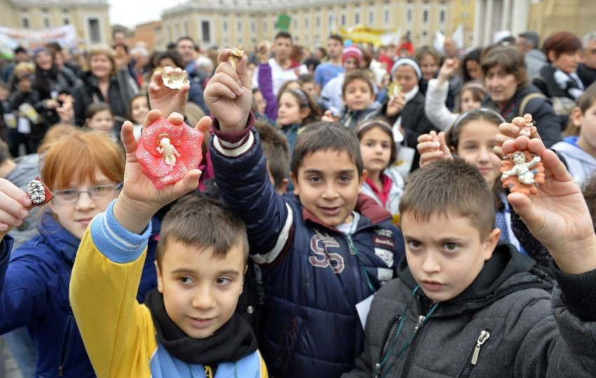 A hagyományoknak megfelelően a Szentatya megáldotta azokat a gyermek Jézust ábrázoló kis szobrocskákat, amelyeket a gyerekek magukkal hoztak, és amelyeket karácsonykor otthoni betlehemükbe fognak elhelyezni. Végezetül egy kis imakönyvet ajándékozott a jelenlévőknek.