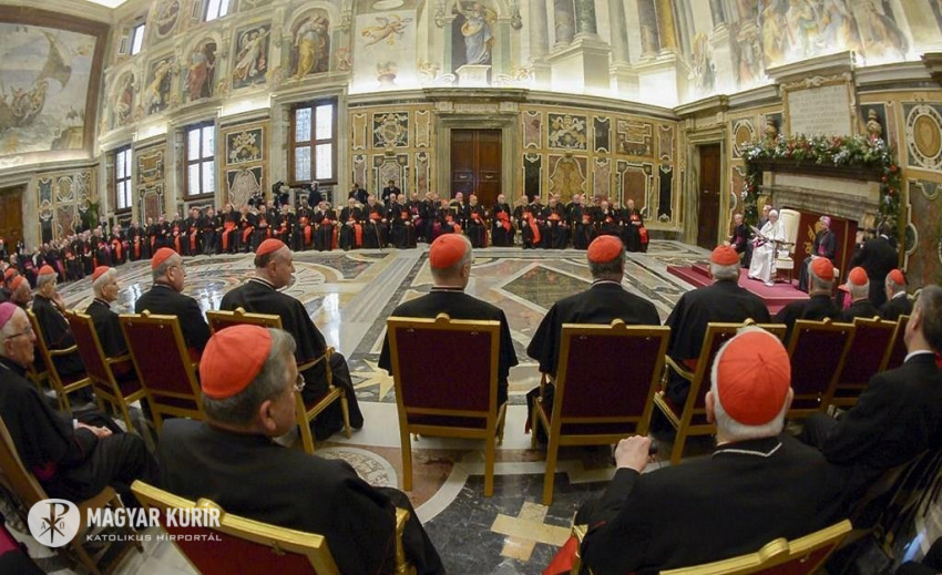 „Mindazonáltal a betegségek és a botrányok nem fedhetik el annak a szolgálatnak a hatékonyságát, amit a Római Kúria fáradsággal, felelősséggel, elkötelezettséggel és odaadással végez a pápa és az egyház számára, és ez nagy vigasz” – hangsúlyozta a Szentatya, majd idézett Szent Ignác lelkigyakorlatos könyvéből: „A rossz szellem sajátossága az, hogy a lelket mardossa, szomorúvá teszi, és hamis okkal nyugtalanítva akadályokat gördít eléje, hogy ne haladhasson előre. A jó szellem sajátossága pedig az, hogy bátorságot, vigaszokat, könnyeket, sugallatokat és nyugalmat ad, mindent megkönnyítve és minden akadályt elgördítve, hogy az ember a jó művelésében egyre előbbre haladjon.” (Lelkigyakorlatok, 315)