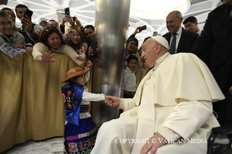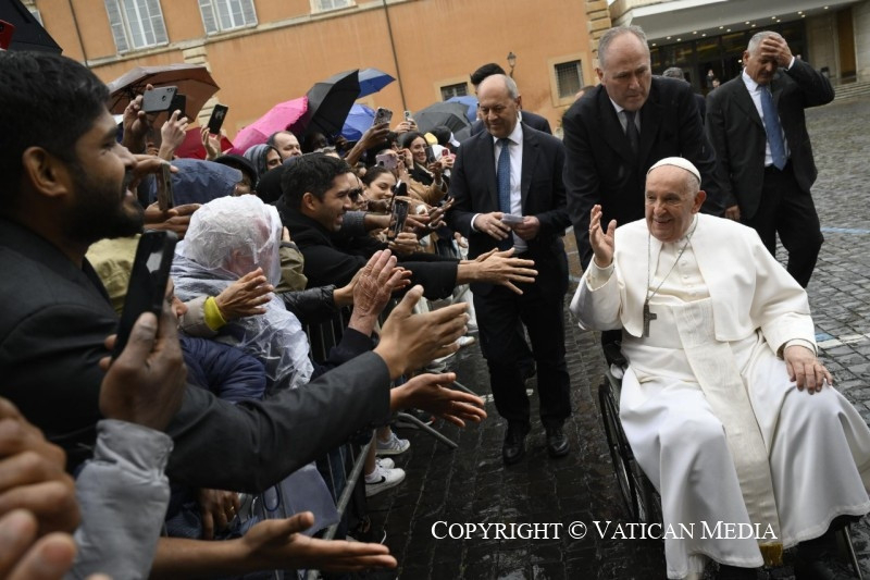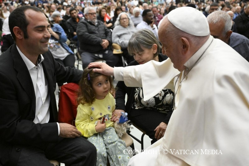 Nyilvánvalóan, ahogy az apostol mondja, a hit nem mindenkié (vö. 2Tessz 3,2), és mi is, akik hívők vagyunk, gyakran azt tapasztaljuk, hogy csak parányi tartalékunk van belőle. Jézus gyakran tehet szemrehányást nekünk – ahogyan a tanítványainak is tett –, hogy „kishitűek” vagyunk. Pedig ez a legboldogabb ajándék, az egyetlen erény, melyet irigyelhetünk. Mert aki hisz, abban olyan erő lakozik, amely nem csak emberi; a hit ugyanis „mozgásba hozza” bennünk a kegyelmet, és megnyitja elménket Isten misztériuma előtt. Ahogyan Jézus mondta egyszer: „Ha csak akkora hitetek lesz is, mint a mustármag, s azt mondjátok ennek a szederfának: »Szakadj ki gyökerestül, és verj gyökeret a tengerben!« – megteszi nektek” (Lk 17,6). Ezért a tanítványokhoz hasonlóan mi is mondjuk neki: Urunk, növeld bennünk a hitet! (vö. Lk 17,5). Ez egy szép ima! Elmondjuk közösen? „Urunk, növeld bennünk a hitet!” Mondjuk együtt: [mindannyian] „Urunk, növeld bennünk a hitet!” Túl halkak vagytok, kicsit hangosabban: [mindannyian] „Urunk, növeld bennünk a hitet!” Köszönöm!