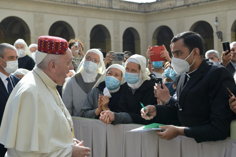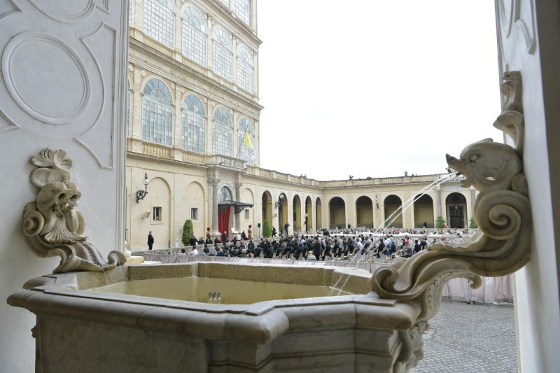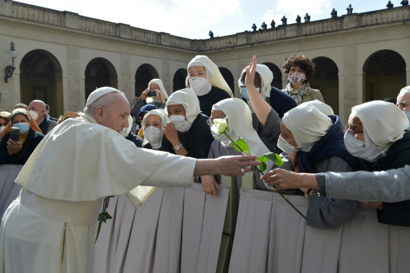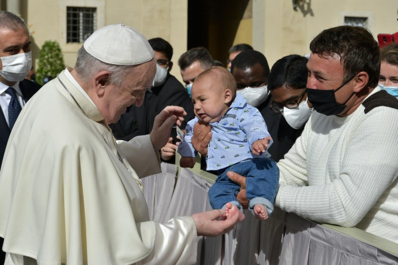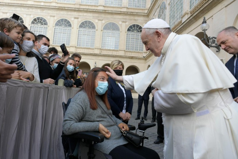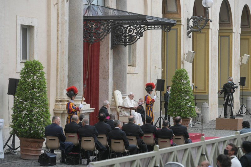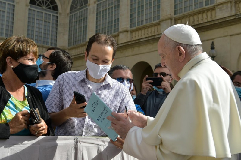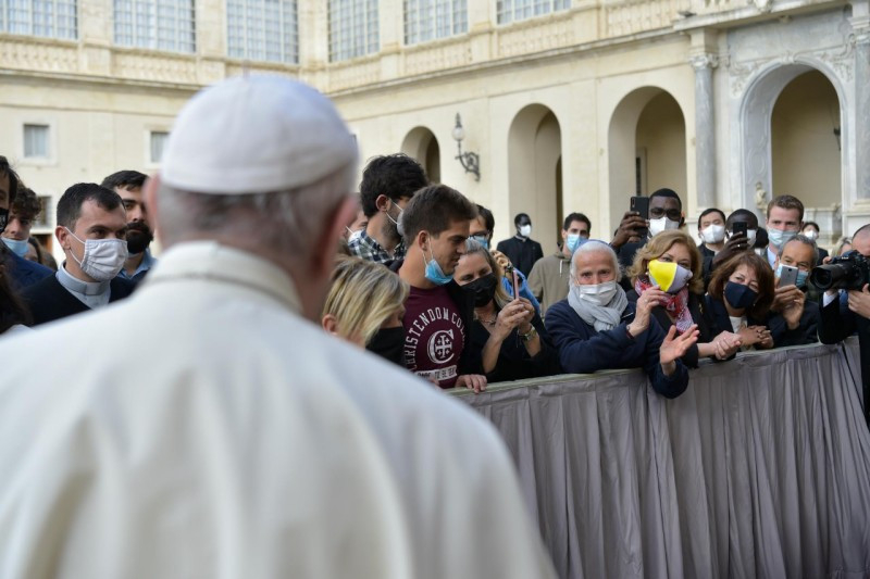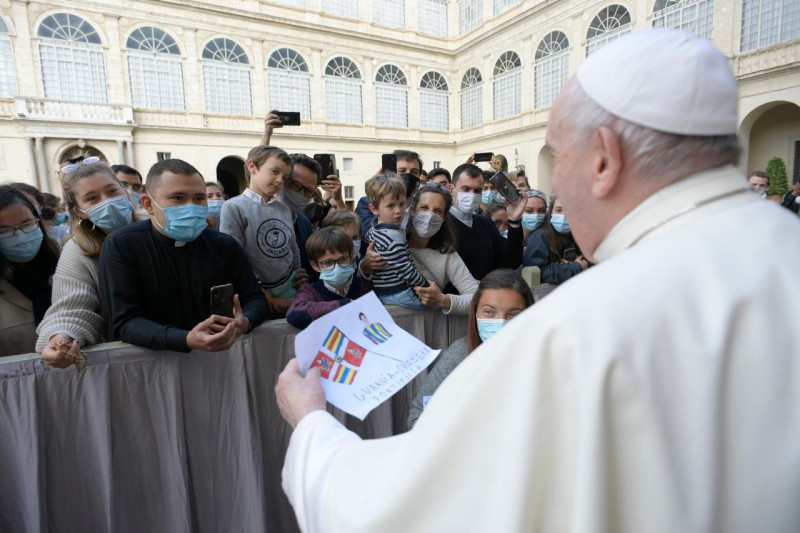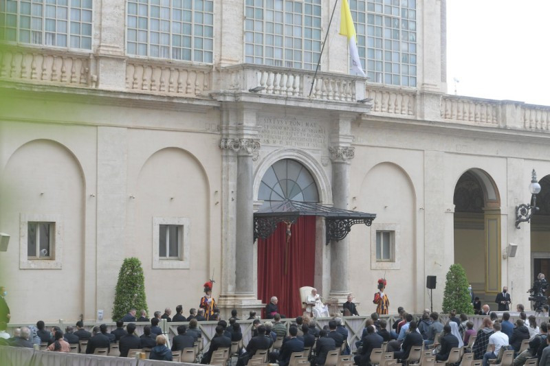 Örülök, hogy újra személyesen találkozhatunk, mert egy dolgot elárulok: nem jó a semmi előtt, egy kamera előtt beszélni. Nem jó. És most, sok hónap után, hála Sapienza atya bátorságának – aki azt mondta: „Nem, ott tartsuk meg” –, itt gyűltünk össze. Bravó, Sapienza atya! Öröm tölt el, hogy láthatom az embereket, találkozhatom veletek! Mindegyikteknek megvan a maga története, mindenhonnan jöttök, Olaszországból, az Egyesült Államokból, Kolumbiából… Aztán az a négy svájci testvérből álló kis focicsapat, azt hiszem, ott vannak, négyen, csak a kishúguk hiányzik, reméljük, ő is megérkezik… Öröm tölt el, hogy láthatlak benneteket, mert mindannyian testvérek vagyunk az Úrban, és ha látjuk egymást, az segít, hogy imádkozzunk egymásért. Olyan emberekről is szó van, akik távol vannak, de mindig közel jönnek. A mindig itt lévő Geneviève nővér, aki [az ostiai] Luna Parkból érkezik, a dolgozó emberek: sokan vannak, és mind itt vannak. Köszönöm jelenléteteket és látogatásotokat! Vigyétek el a pápa üzenetét mindenkihez! A pápa üzenete az, hogy imádkozom mindenkiért, és kérem, hogy imádkozzanak értem. Legyünk egyek az imádságban!
