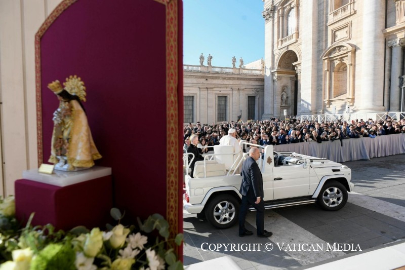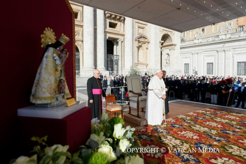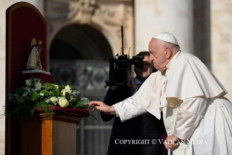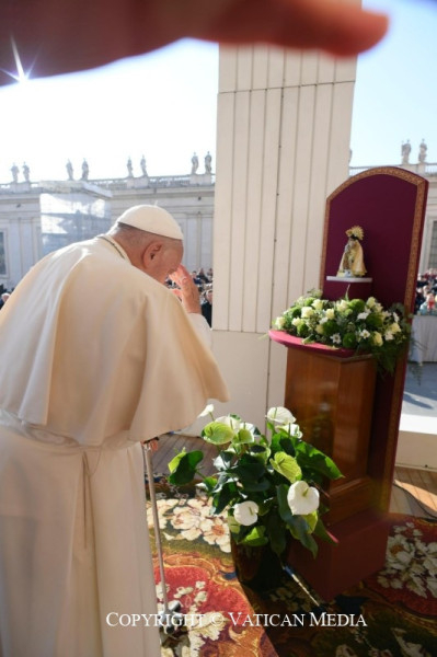 Szeretném üdvözölni a Virgen de los Desamparadost [a Védtelenek Szüzét], a szegényekre gondot viselő Szűzanyát, Valencia védőszentjét, Valenciáét, amely nagyon sokat szenved, és Spanyolország más részei is, de különösen Valencia, amely víz alatt áll, és szenved. Azt akartam, hogy itt legyen Valencia védőszentje. Ezt a képet maguk a valenciaiak ajándékozták nekem. Ma különben is imádkozzunk Valenciáért és Spanyolország más térségeiért, amelyek az árvíz miatt szenvednek.