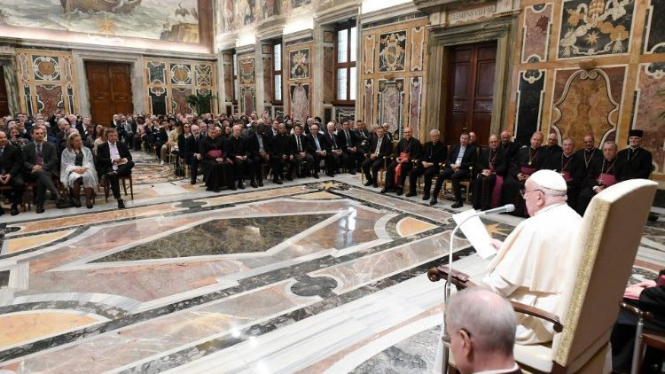 Ezekben a napokban a plenáris ülésen arról gondolkodtatok, miként lehet a szinodális kommunikációt elősegíteni. A most lezárult, szinodalitásról szóló szinódus stílusát kell átvennie ezentúl az egész Egyháznak. Közösségi életünk minden megnyilvánulásában az a feladatunk, hogy visszhangozzuk azt az isteni szeretetet, amely Krisztusban vonzott és vonz minket. Ez jellemzi az Egyházhoz tartozást: ha ugyanis politikai vagy vállalati kategóriák szerint gondolkodnánk és cselekednénk, akkor nem volnánk Egyház. Ha világias szempontokat alkalmaznánk, vagy ha szervezeteinket bürokráciára redukálnánk, akkor nem lennénk Egyház. Egyháznak lenni azt jelenti, hogy abban a tudatban élünk, hogy az Úr szeret minket előbb, ő hív minket először, ő bocsát meg nekünk először. Mi pedig ennek a határtalan irgalmasságnak a tanúi vagyunk, amelyet ingyenesen kaptunk, és ezzel megváltozott az életünk.