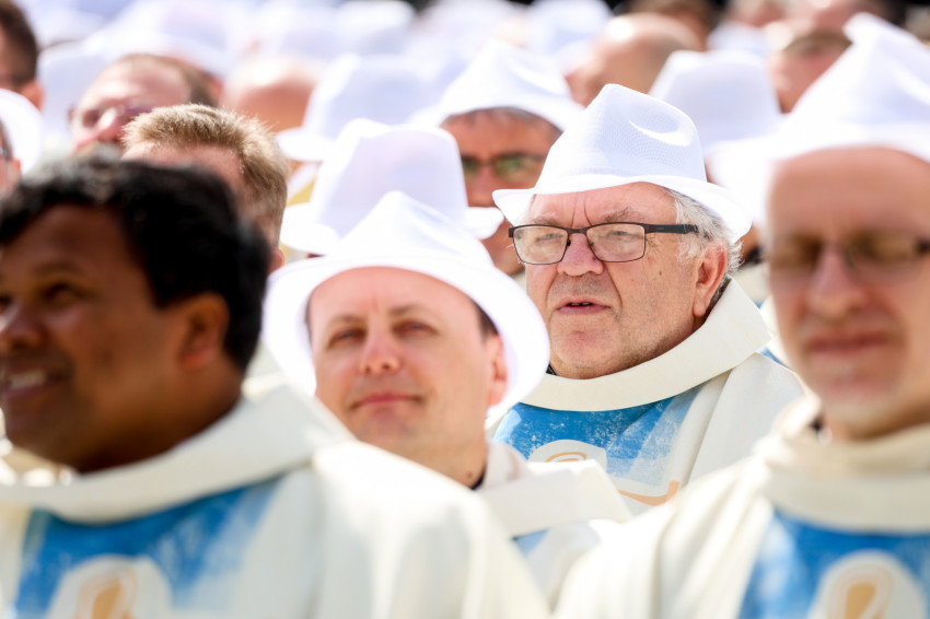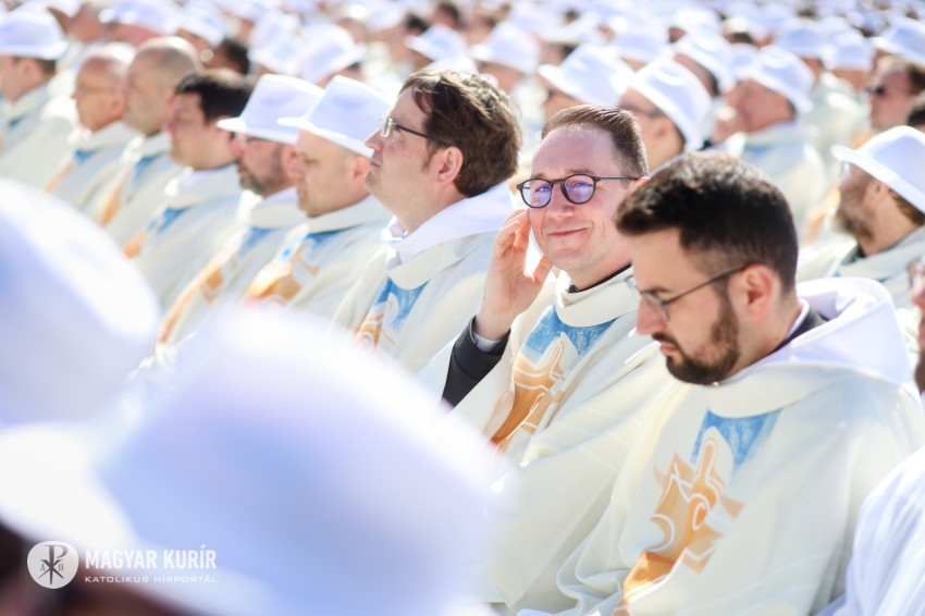 Testvérek, ahogy ma reggel itt vagyunk, érezzük meg annak örömét, hogy Isten szent népe vagyunk: mindannyian az ő meghívásából születünk; ő gyűjtött egybe minket, és ezért vagyunk az ő népe, az ő nyája, az ő Egyháza. Azért hívott itt egybe minket, különbözzünk bár egymástól és tartozzunk bár különböző közösségekhez, hogy szeretetének nagysága mégis egyetlen ölelésben egyesítsen minket. Olyan szép, ahogy most együtt vagyunk: püspökök és papok, szerzetesek és világi hívők; olyan jó, hogy ezt az örömöt más keresztény felekezetek küldötteivel, a zsidó közösség vezetőivel, a civil szervezetek képviselőivel és a diplomáciai testülettel is megoszthatjuk. Ez a katolicitás: mindannyiunkat, akiket a Jó Pásztor név szerint szólított meg, arra hívott, hogy szeretetét befogadjuk és továbbadjuk, hogy az ő nyáját befogadóvá tegyük és sohasem kirekesztővé. És ezért mindannyian arra kaptunk meghívást, hogy ápoljuk a testvériség és az együttműködés kötelékeit, megoszlás nélkül,