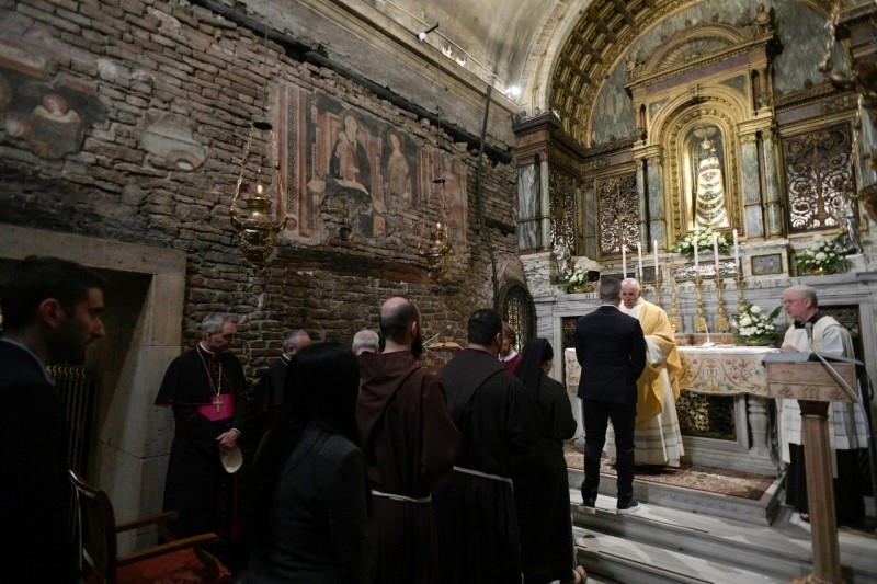 Gábriel angyal Máriához intézett szavai – „Örülj, kegyelemmel teljes” (Lk 1,28) – egyedülállóan hangzanak fel ezen a kegyhelyen, ezen a különleges helyen, ahol Isten Fia megtestesülésének misztériumát szemléljük. Itt őrzik ugyanis azokat a falakat, amelyek a hagyomány szerint Názáretből származnak, ahol a Szent Szűz kimondta igenjét, és így Jézus anyjává vált. Azóta, hogy a „Mária házának” nevezett épület tisztelt és szeretett hely lett ezen a dombon, Isten anyja nem szűnik meg segíteni, hogy lelki kegyelmek szülessenek azokban, akik hittel és áhítattal jönnek ide imádkozni. Ma hozzájuk csatlakozom én is, és megköszönöm Istennek, hogy éppen Urunk születése hírüladásának ünnepén adta meg ezt nekem.
