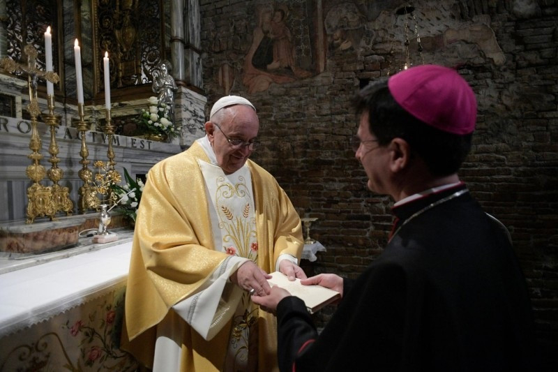 Ez a Szent Ház a fiatalok háza, mert itt Szűz Mária, a kegyelemmel teljes fiatal leány ma is szól az új nemzedékekhez, és mindegyiküket kíséri hivatásának megtalálásában. Ezért akartam itt aláírni a fiataloknak szentelt szinódus gyümölcseként született apostoli buzdítást. A címe: Christus vivit – Krisztus él. Jézus születése hírüladásának eseményében megláthatjuk a hivatásnak azt a dinamikáját, amelyet a szinódus három szakasza is kifejez: Isten szavának-tervének meghallása; 2) mérlegelés, tisztázás; 3) döntés.