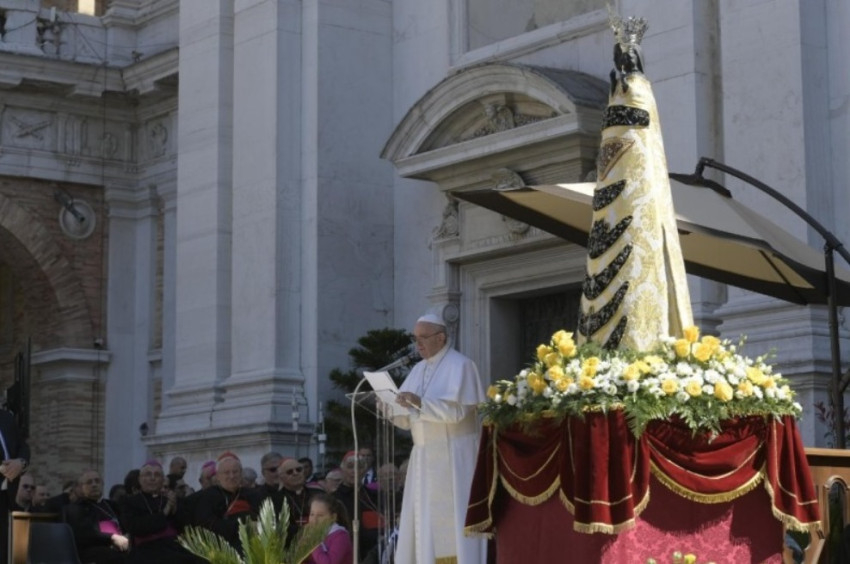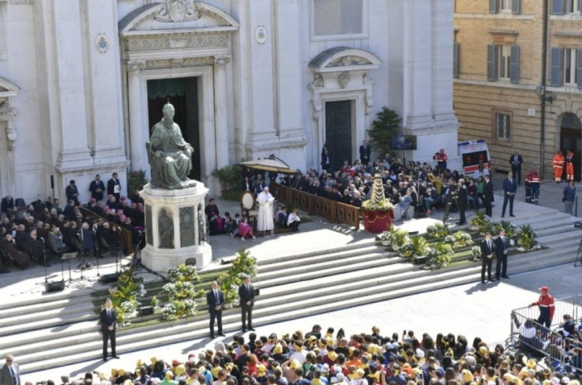 Kedves testvéreim! Márián keresztül Isten a mai korban küldetést bíz rátok és mindazokra, akik ehhez a kegyhelyhez kötődnek: vigyétek el a béke és az élet evangéliumát kortársainknak, akik sokszor teljesen másra figyelnek, földi érdekek vezérlik őket vagy lelki szárazságba süllyedtek. Egyszerű és bölcs, alázatos és bátor, szegény és nagylelkű emberekre van szükség. Egyszóval olyanokra, akik, Mária iskolájában, fenntartás nélkül befogadják az evangéliumot életükbe. Így, Isten népe életszentségén keresztül, erről a helyről továbbra is eljutnak Olaszországba, Európába és a világba a minden életállapotban megélt életszentség tanúságtételei, hogy megújítsák az Egyházat és életet vigyenek a társadalomba Isten országának kovászával.