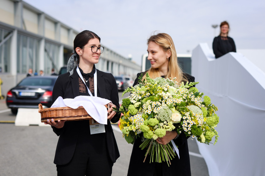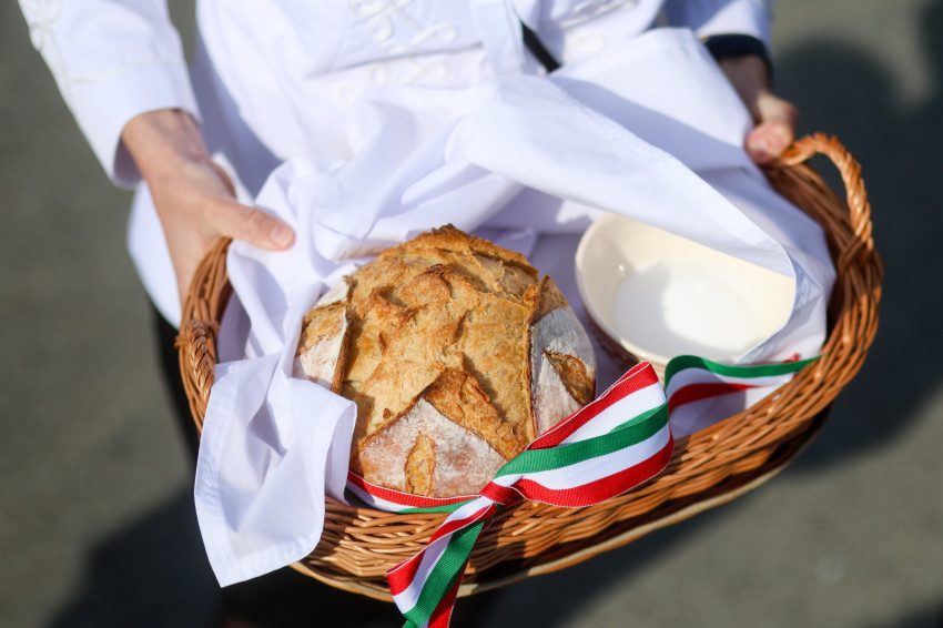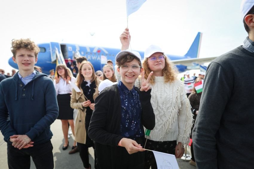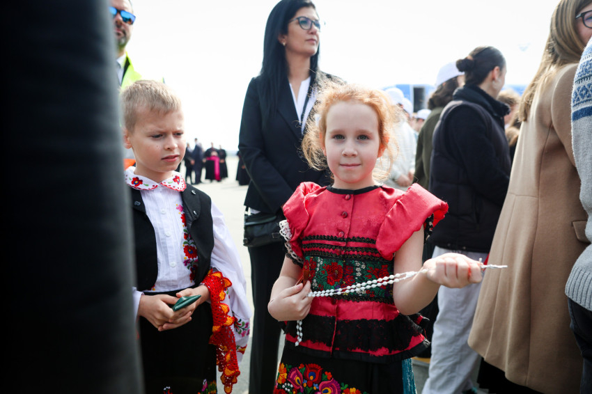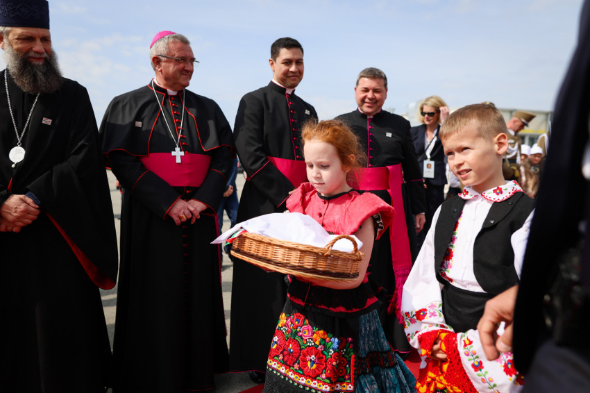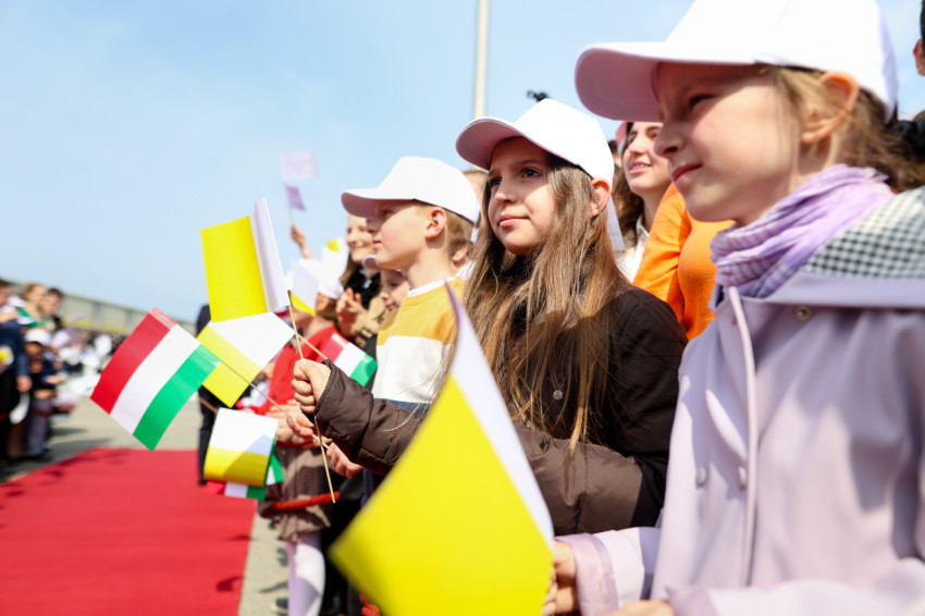 Ferenc pápát üdvözölte több tucat gyermek is, akik a Katolikus Egyház világi munkatársainak gyermekei, közülük ketten frissen sült kenyeret és sót adtak át a Szentatyának.
