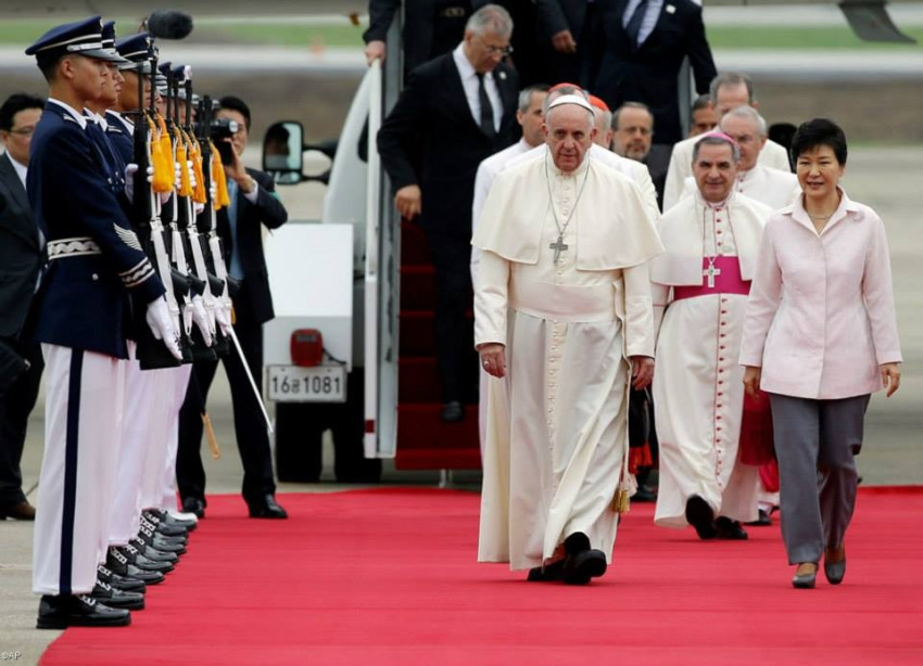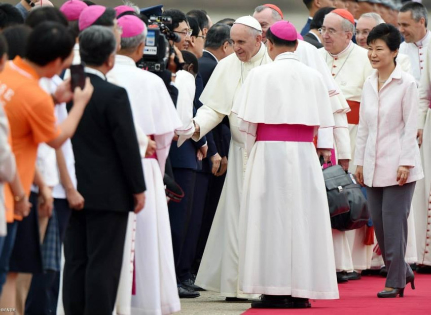 A pápai repülőgép helyi idő szerint 10 óra 15 perckor szállt le Szöul repülőterén, ahol a Szentatyát a köztársasági elnöknő, Pak Kunhje fogadta.