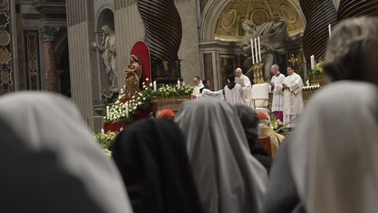 Íme, a megszentelt élet: dicsőítés, mely örömre gyújtja Isten népét, prófétai látás, mely felfedi azt, ami számít. Amikor a megszentelt élet ilyen, akkor virágzik és felhívássá válik mindenkinek a középszerűség ellen: az ellen, hogy csökkentsük a magasságot a lelki életben, a kísértés ellen, hogy engedményeket csikarjunk ki Istennél, a kényelmes és világias élethez való alkalmazkodás ellen, a panaszkodás – az állandó panaszkodás! –, az elégedetlenkedés és az önsajnálat ellen, azon szokásunk ellen, hogy azt mondjuk: „tesszük, amit tehetünk”, „mindig is így csináltuk”: ezek nem Isten szerinti mondatok! A megszentelt élet nem túlélés, nem készület az „ars bene moriendi”-re [a szép halálra]: ez a jelenlegi kísértés a hivatások csökkenése láttán. Nem! Nem túlélés, hanem új élet! „Jaj, de hát kevesen vagyunk…” – új élet! A megszentelt élet élő találkozás az Úrral az ő népében, hívás a mindennapok hűséges engedelmességére és a Lélek hallatlan meglepetéseire, annak látása, akit érdemes átölelni, hogy örömünk legyen: Jézus!