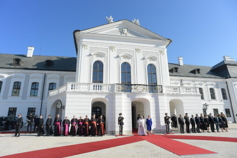 Szeptember 13-án, hétfőn reggel Pozsonyban az elnöki hivatalnak otthont adó Grassalkovich-palotában Zuzana Čaputová köztársasági elnök fogadta Ferenc pápát. A Szentatya üdvözlését követően az épület aranytermében négyszemközti találkozóra került sor, itt a pápa a palota emlékkönyvébe a következő szavakat írta: