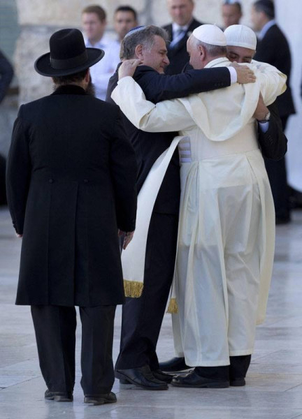 Mindhárman meghatottan ölelték át egymást. Jeruzsálem szent városának szívében, a három nagy monoteista vallás bölcsőjében barátilag átölte egymást a zsidóság, a kereszténység és az iszlám három vezető képviselője.