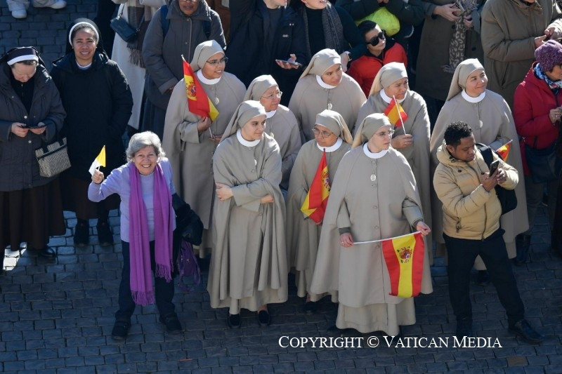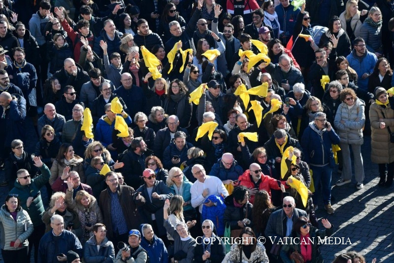 Köszöntöm a Pero-Cerchiate-i híveket, a varesei esperesi kerület csoportját, a cadoneghei és a San Pietro in Carianó-i fiatalokat; a clusonei, chiudunói, Adrara San Martinó-i és Almenno San Bartolomeó-i bérmálkozó fiatalokat, valamint a latinai, vastói és soviorei cserkészeket. És köszöntöm a Szeplőtlen Szűzanya-plébániához tartozó fiatalokat!