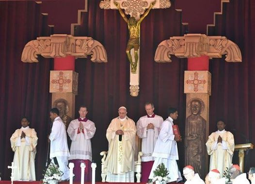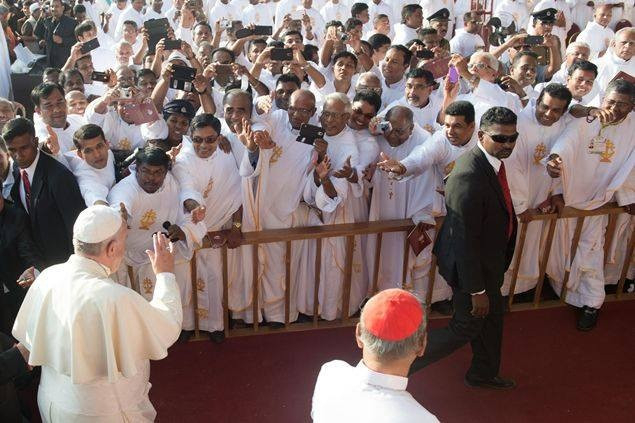 A dél-indiai Goa tartomány szülötte, Vaz Szent József oratoriánus szerzetes a misszionárius buzgóság és az itteni lakosok iránti nagy szeretet indíttatására érkezett az országba. Az akkori vallásüldözés miatt koldusnak öltözött, papi kötelezettségeit titokban végezte, amikor a hívekkel találkozott, gyakorta éjjel. Erőfeszítései lelki és erkölcsi támogatást jelentettek az üldözött katolikus lakosságnak. Különleges vágya volt, hogy a betegeket és szenvedőket szolgálja. A Kandy városban dúló himlőjárvány idején betegápoló szolgálata kiváltotta a király megbecsülését is, aki nagyobb szabadságot adott számára szolgálata betöltéséhez. Így aztán Kandyból kiindulva tudta elérni a szigetország más területeit. Élete felemésztődött a misszionárius munkában, és végső kimerültségben halt meg 59 éves korában, amikor már szentként tisztelték. Vaz Szent József továbbra is példa és mester marad sok szempontból, ezek közül háromra szeretnék összpontosítani – folytatta beszédét a pápa.
