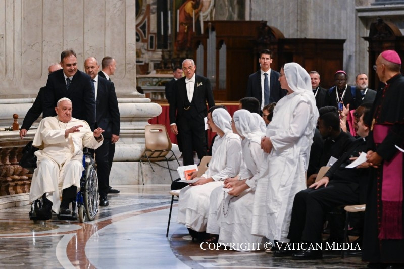Hozzá hasonlóan hátul maradunk, felszabadítjuk az önhittségünk, képmutatásunk és gőgünk által elfoglalt teret. Mondjuk ki ezt mi, püspökök, papok, szerzetesek is: felszabadítjuk az önhittségünk, képmutatásunk és gőgünk által elfoglalt teret.