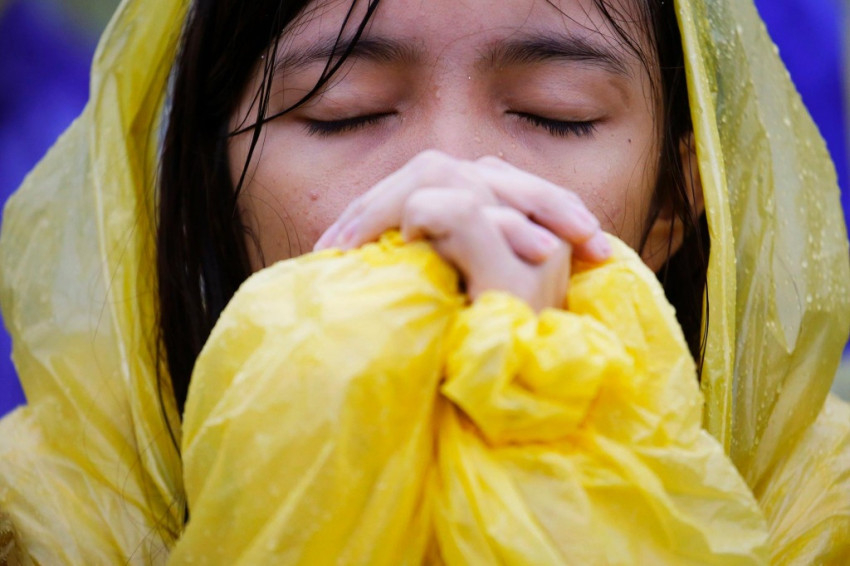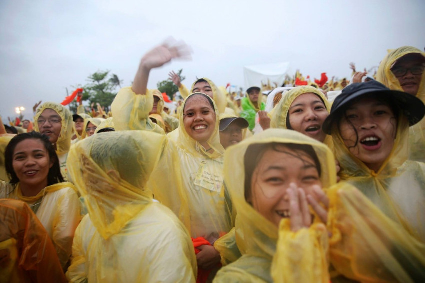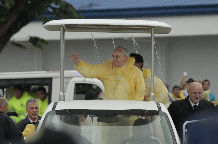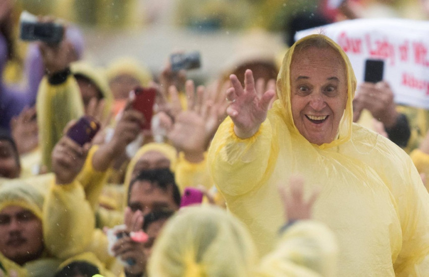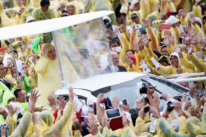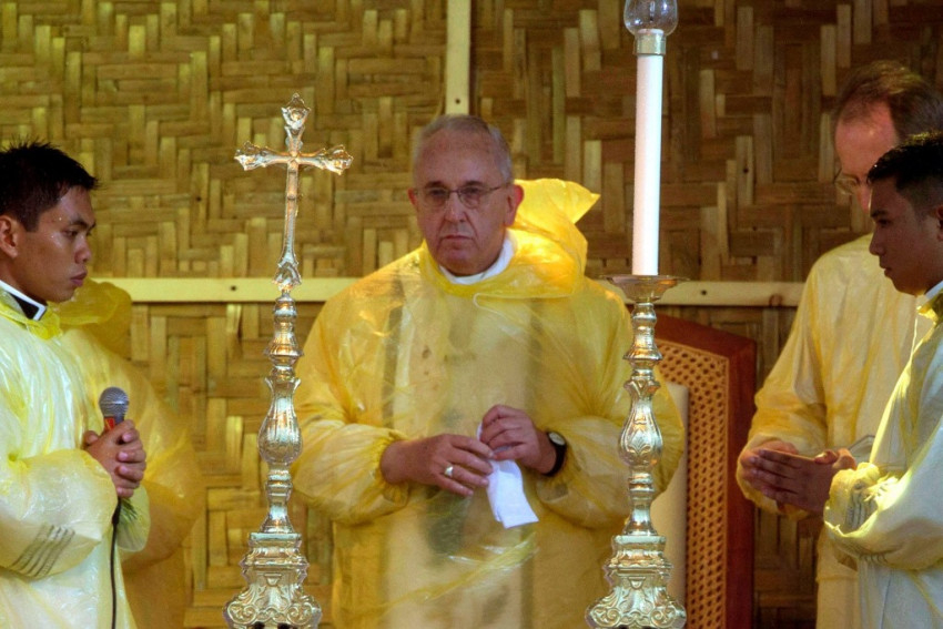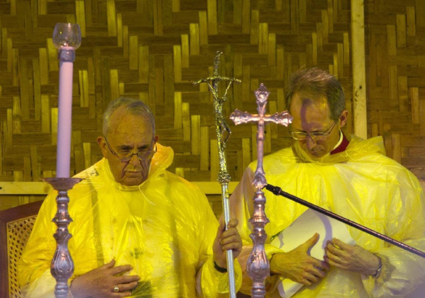 Egy kisebb erősségű tájfun közeledte miatt pár órával előbbre hozták a szentmise kezdetét. A viharos szélben Ferenc pápa maga is sárga műanyag esőkabátot vett fel. Tekintettel a rendkívüli körülményekre a pápa – eltekintve az előre készített homíliájától – teljes egészében szabadon fogalmazta meg beszédét, melyet spanyol nyelven mondott el és amelyet angolra fordítottak. Alábbiakban közreadjuk a Szentatya homíliáját.