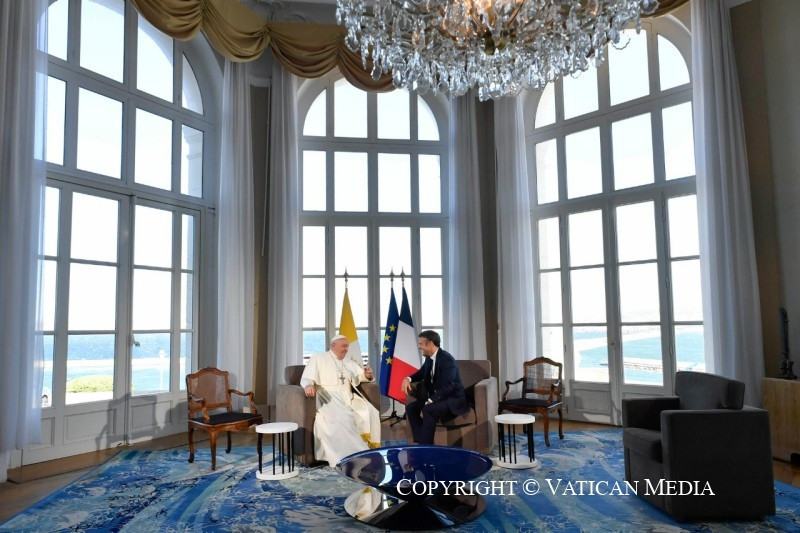 A Szentatyát Emmanuel Macronnal együtt felesége, Brigitte köszöntötte. Az elnök a nagyterem első sorában ült, ahol a pápa beszédet mondott a Földközi-tenger térségében fekvő országok ökumenikus és vallásközi találkozójának záróprogramján.