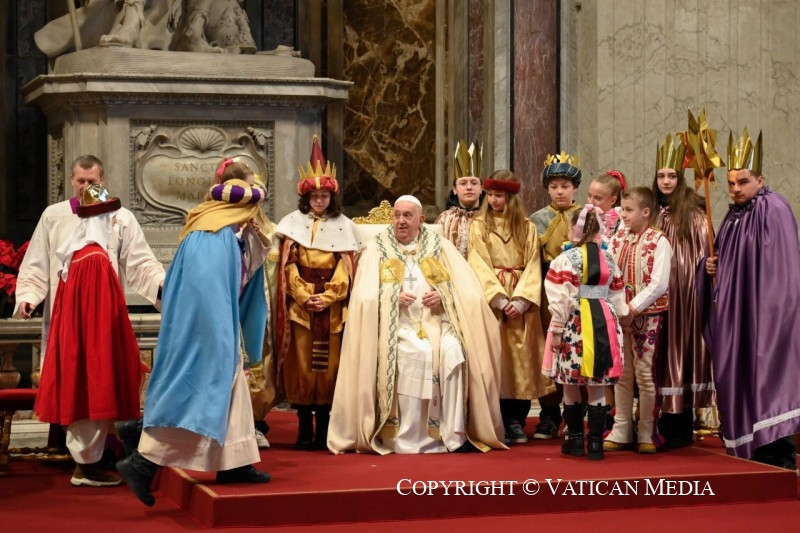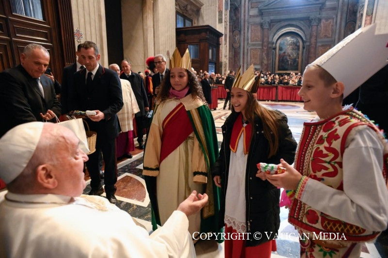 Testvéreim, jó arra gondolni, hogy Mária, a názáreti leány mindig visszavezet bennünket Fiának, Jézusnak a misztériumához. Emlékeztet arra, hogy Jézus testben jön el, és ezért a kiváltságos hely, ahol találkozhatunk vele, az elsősorban az életünk, a törékeny emberségünk, azoknak az embersége, akik nap mint nap elmennek mellettünk. És azzal, hogy Máriát Isten anyjának szólítjuk, azt mondjuk, hogy Krisztus, bár az Atyától született, mégis valóságosan egy asszony méhéből születik a világra. Azt mondjuk, hogy bár ő az idők ura, mégis szerető jelenlétével a mi időnkben lakozik, ebben az új esztendőben is. Azt mondjuk, hogy ő a világ Üdvözítője, mégis találkozhatunk vele és keresnünk kell őt minden ember arcában. És ha ő, aki Isten Fia, kicsivé tette magát, hogy egy édesanya a karjába vegye, hogy ápolja és szoptassa, akkor ez azt jelenti, hogy ő ma is eljön mindazokban, akiknek ugyanilyen gondoskodásra van szükségük: minden testvérünkben, akivel találkozunk, és akinek figyelemre, meghallgatásra, gyengédségre van szüksége.