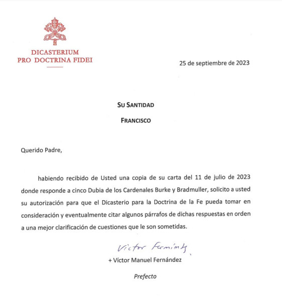 Kedves Atyám! Miután megkaptam Öntől annak a 2023. július 11-én kelt levelének a másolatát, amelyben Burke és Brandmüller bíboros öt kérdésére válaszolt, kérem engedélyezze, hogy ezeket a válaszokat a Hittani Dikasztérium figyelembe vehesse és adott esetben néhány bekezdésüket idézhesse a szóban forgó témák alaposabb tisztázása végett.