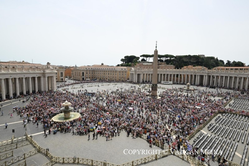 Ne feledkezzünk meg a meggyötört ukrán népről sem, mely a leginkább szenved és a legjobban vágyik a békére. Köszöntöm ezt a zászlót tartó ukrán csoportot. Közel vagyunk hozzátok! Békevágy tölt el benneteket. Ezért bátorítom mindazokat az erőfeszítéseket, amelyek ara irányulnak, hogy a béke – nemzetközi segítséggel – minél hamarabb megvalósuljon. Ne feledkezzünk meg Mianmarról sem!