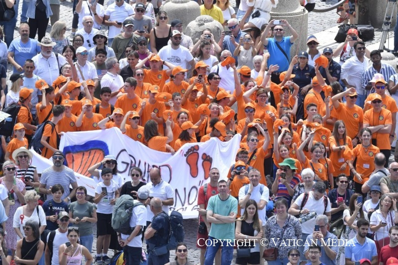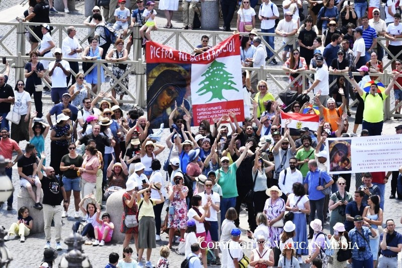 Köszöntelek mindnyájatokat, rómaiak és zarándokok! Külön is köszöntöm a libanoni, egyiptomi és spanyolországi híveket; a London Oratory School diákjait; a lengyelországi Opole egyházmegyéből és a Budapest-Albertfalváról érkezett diákokat; a Világiak Európai Fórumának résztvevőit, akik a „Hit, művészet és szinodalitás” témáról tanácskoznak; valamint a Rómában élő kongói katolikus közösséghez tartozó édesanyák csoportját. Ezek az édesanyák szépen énekelnek! Szívesen meghallgatnám őket újból. Köszöntöm Carini, Catania, Siracusa és Messina híveit; a mestrinói elsőáldozó és bérmálkozó gyerekeket és fiatalokat, Castelsardo (Sassari), Bolgare (Bergamo) és Camin (Padova) bérmálkozóit; végül szeretnék köszönetet mondani a véradóknak, akik most tartották országos ünnepüket.