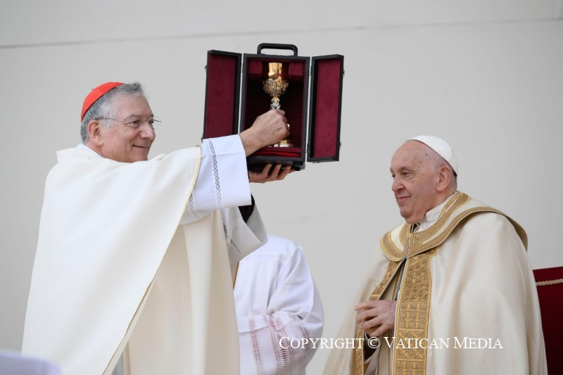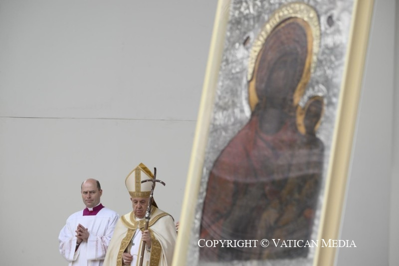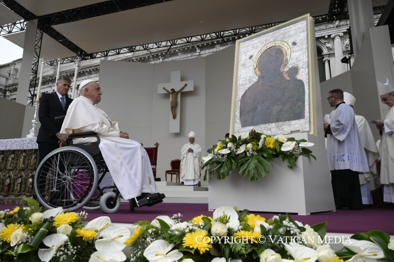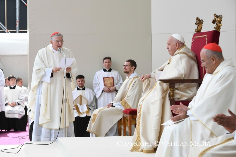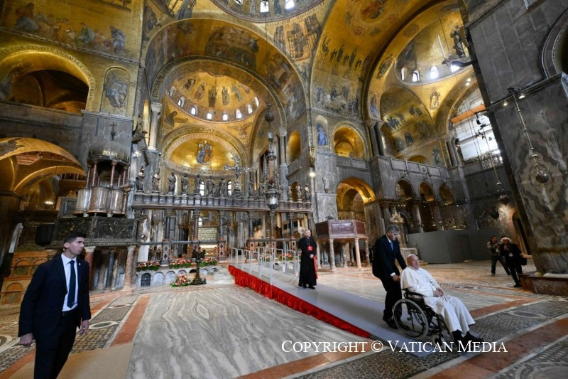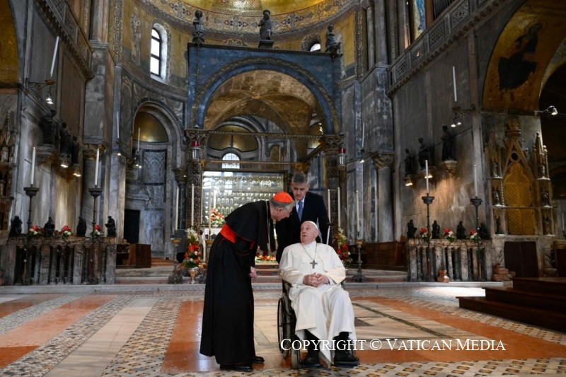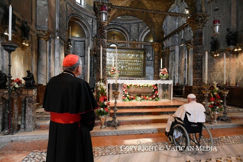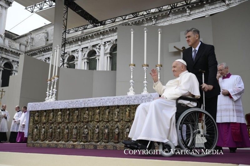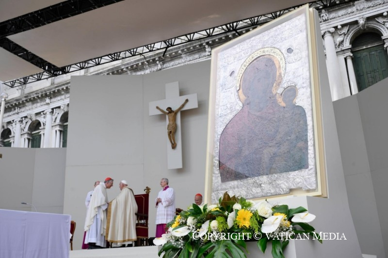 Mielőtt befejeznénk a szentmisét, szeretnélek köszönteni mindannyiótokat, aki részt vettetek rajta. Szívből mondok köszönetet Francesco Moraglia pátriárkának, és vele együtt a munkatársaknak és az önkénteseknek. Hálás vagyok a világi hatóságoknak és a rendvédelmi szerveknek, akik megkönnyítették e látogatás lebonyolítását. Köszönöm mindannyiuknak!