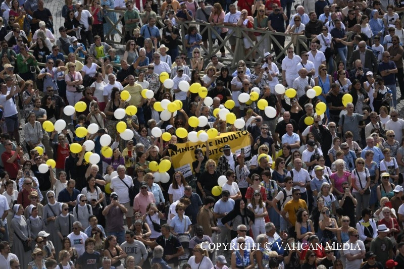 Üdvözlöm annak a menetnek a résztvevőit, akik a fogvatartottak életkörülményeire kívánják felhívni a figyelmet. Dolgoznunk kell azon, hogy a fogvatartottak méltó körülmények között élhessenek. Mindenki követhet el hibát. Az ember azért van fogságban, hogy utána tisztességes életet folytathasson. Üdvözlöm az ataxiás betegek napjára jött küldöttséget és a Castagnola di Massából érkezett „La Palma” egyesületet.