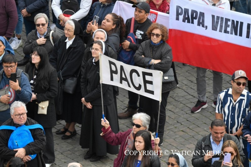 Testvéreim, imádkozzunk továbbra is a meggyötört Ukrajnáért – látom itt a zászlókat –, Palesztina és Izrael lakosságáért. A béke lehetséges. Jóakarat kell hozzá. A béke lehetséges. Ne törődjünk bele a háborúba! Ne felejtsük el, hogy a háború mindig, mindig vereség. Csak a fegyvergyártók nyernek.