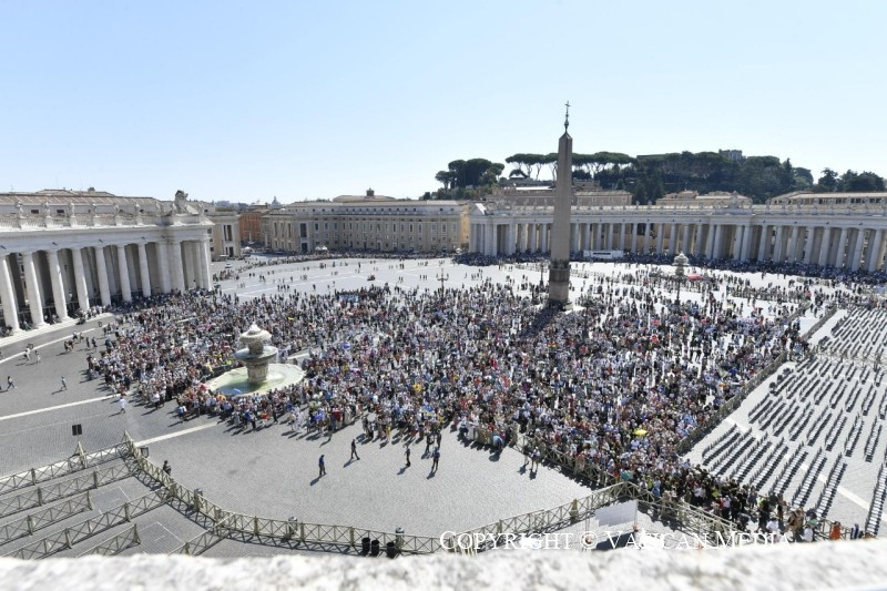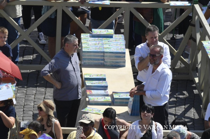 A hitoktatási év kezdetéhez közeledve az Elledici, a szaléziak könyvkiadója ma a téren jelenlévőknek egy Passo dopo passo [Lépésről lépésre] című kateketikai segédletet ajándékoz: gyönyörű ajándék! Szeretném megragadni az alkalmat, hogy megköszönjem a katekéták értékes munkáját, és kívánom a hitoktatásra járó fiúknak és lányoknak a Jézussal való találkozás örömét.