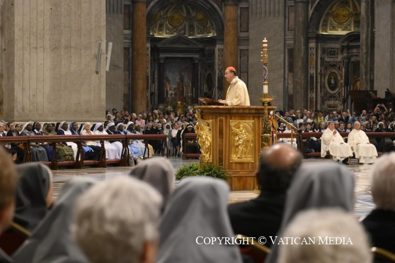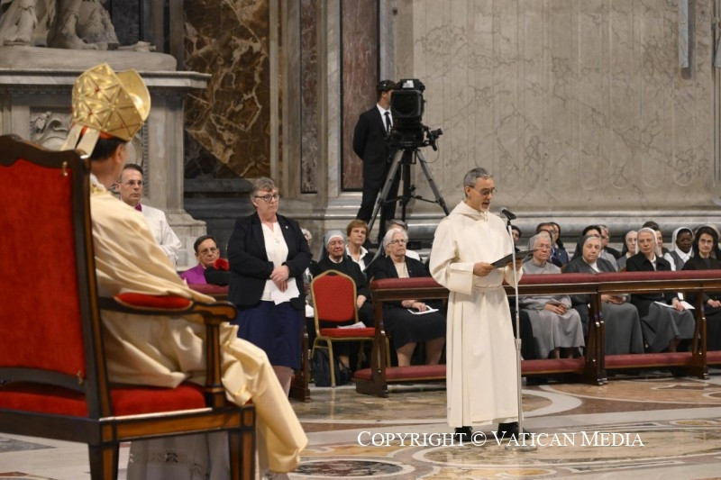 Testvéreim, nővéreim, igaz, hogy mindannyian, ez az egész gyülekezet, mint megkereszteltek arra kaptunk meghívást, hogy a meghalt és feltámadt Úr Jézus tanúi legyünk. De az is igaz, hogy mi, megszentelt férfiak és nők is megkaptuk ezt a hivatást, ezt a tanítványságra való meghívást, mely tőlünk azt kívánja, hogy egész életünkkel tegyünk tanúságot Isten elsőbbségéről. Ez a küldetés különösen fontos akkor, amikor – mint ma a világ sok részén – az emberek Isten hiányát tapasztalják, vagy túl könnyen megfeledkeznek Isten központi szerepéről. Felvállalhatjuk és magunkévá tehetjük hát Szent Benedek apát programját, melyet a „semmit sem helyezzünk Krisztus szeretete elé” jelmondat foglal össze.