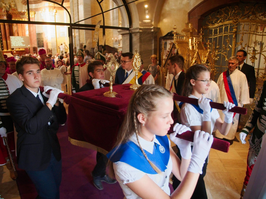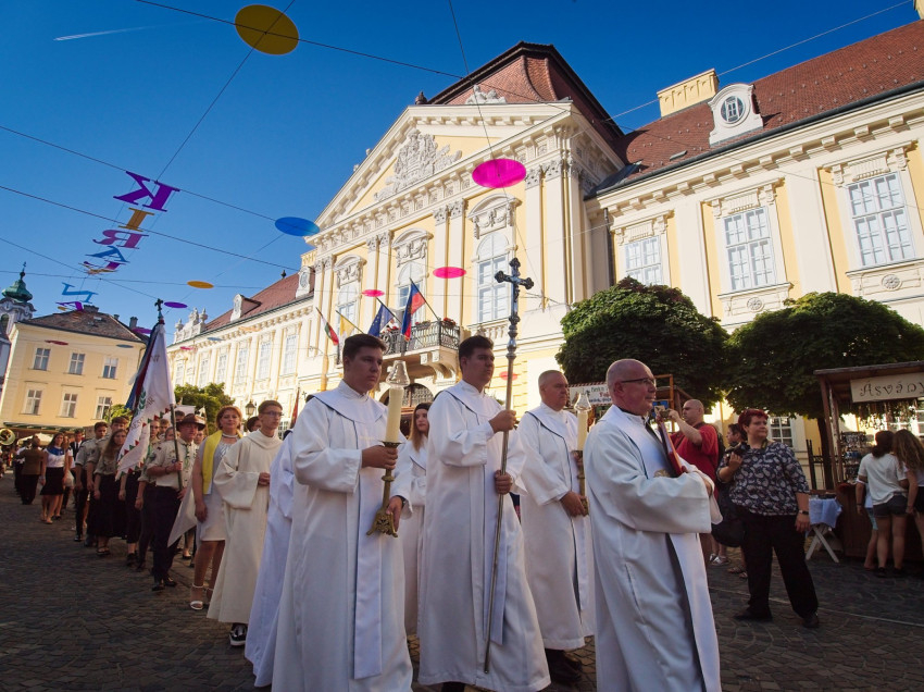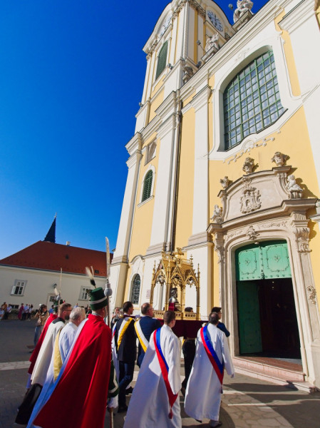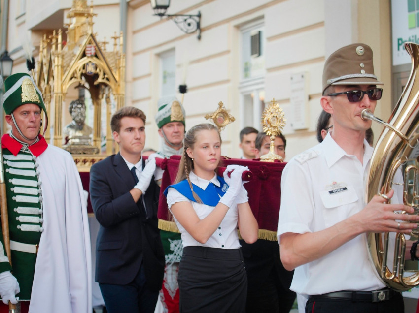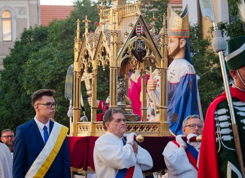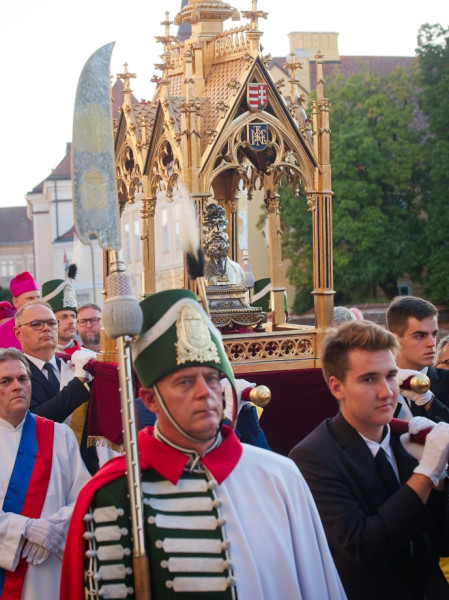 A Szent István-i országfelajánlás emlékét méltón őrizve a Ruff Tamás karnagy vezényelte Székesfehérvári Helyőrségi Zenekar kíséretével az egykori szakrális főváros főterét végigjárva, ünnepi körmenetben vitték a Magyar Szent Család – Szent István, Boldog Gizella és Szent Imre – ereklyéit a püspöki palotából a székesegyházba Ugrits Tamás pasztorális helynök, püspöki irodaigazgató vezetésével. A megjelent papság, köztük Francz Kaspar kanonok, a város cserkészei, katolikus iskolásai, a helyi közéleti vezetők, a közintézmények, társadalmi szervezetek képviselői, a Hagyományőrző Koronaőrök, a Történelmi Vitézi Rend és a lovagrendek tagjai, a rendvédelmi és társadalmi szervezetek képviselői, az oktatási intézmények és egyházközségek küldöttei zászlókkal vonultak végig a menetben, hogy hitvalló módon fejezzék ki a szentek iránti tiszteletüket. A Magyar Szent Család ereklyéit a Szent István király-székesegyház oltárára helyezték el.