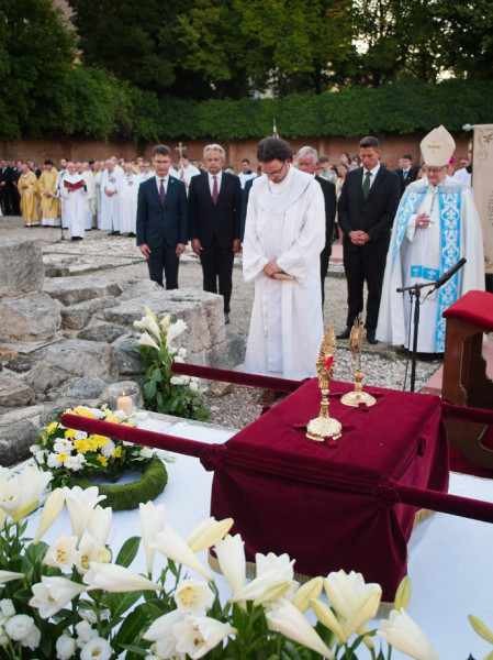 Sokfelé ismétlik el ezen a napon és majd 20-án is a király nyomán a felajánlás szavait; sokan emlékeznek arra, hogy a történelem tanúsága szerint mit köszönhetünk ennek az uralkodónak, felajánló gesztusának. Mi itt ezt akkor tehetjük és ott tehetjük, ahol Szent István is tette, augusztus 14-én, a halála előtti napon, a korán tragikus körülmények között meghalt Imre sírjánál, ahol ez az esemény, a felajánlás 1038-ban megtörténhetett.”
