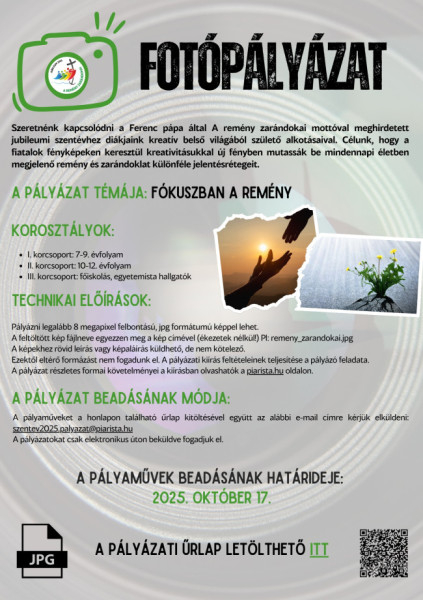 A pályaműveket az ITT ELÉRHETŐ űrlap kitöltésével együtt az alábbi e-mail-címre kérik elküldeni: szentev2025.palyazat@piarista.hu