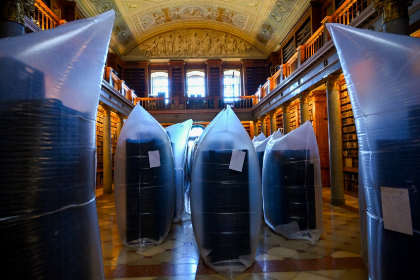 Augusztusban, miután az összes kötetet becsomagolták, egy újabb szakembergárda nekiállt a polcok fertőtlenítésének. Biocid anyaggal lekenték az összes fafelületet, takarófóliával fedték el; majd ki kellett várni a szellőzési, párolgási időt. Ezután érkeztek az écsi asztalosok, hogy alátámasztásokkal megerősítsék a kétszáz éves polcokat.