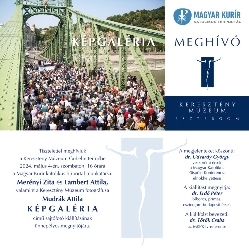 Szeretettel hívunk minden érdeklődőt az esztergomi Keresztény Múzeum Gobelin termébe május 4-én, szombaton 16 órára a Magyar Kurír munkatársai, Merényi Zita és Lambert Attila Képgaléria című sajtófotó-kiállításának megnyitójára. A tárlaton a Keresztény Múzeum fotográfusa, Mudrák Attila esztergomi képes tudósításaiból is látható egy válogatás.
