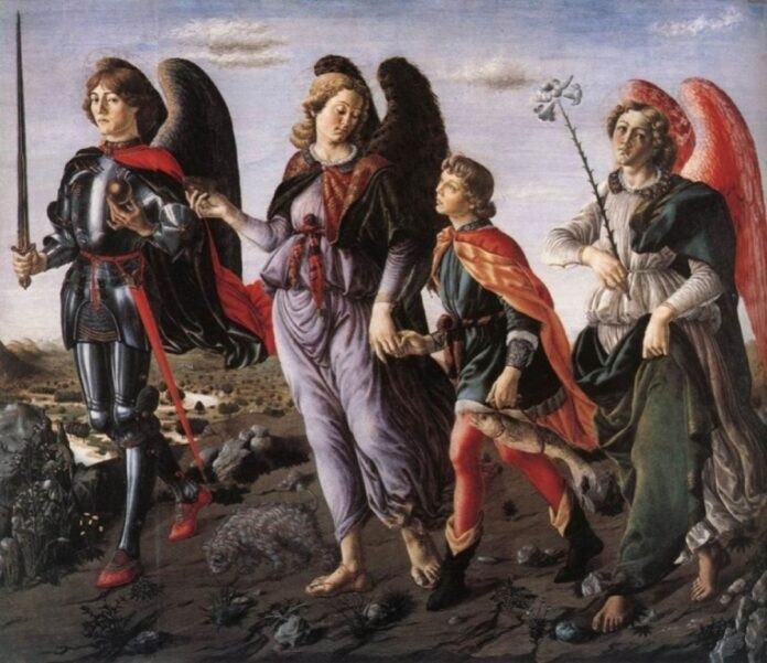 A festményen az angyalok a Szentírásban betöltött szerepüknek megfelelően vannak ábrázolva. Mihály a harcos, aki páncélban jelenik meg. Mellette Rafael a kezében gyógyszeres edénnyel és Tóbiással az oldalán, akit elkísér útján. Gábor pedig liliommal, a tisztaság jelképével áll előttünk, aki a Szűzanyának adta hírül Krisztus születését. Mindhárom angyal együttesen a három isteni erényt is megjeleníti. Mihály a harcos hitet, Rafael a nehézségekben való reményt és Gábor az egészen tiszta szeretetet.