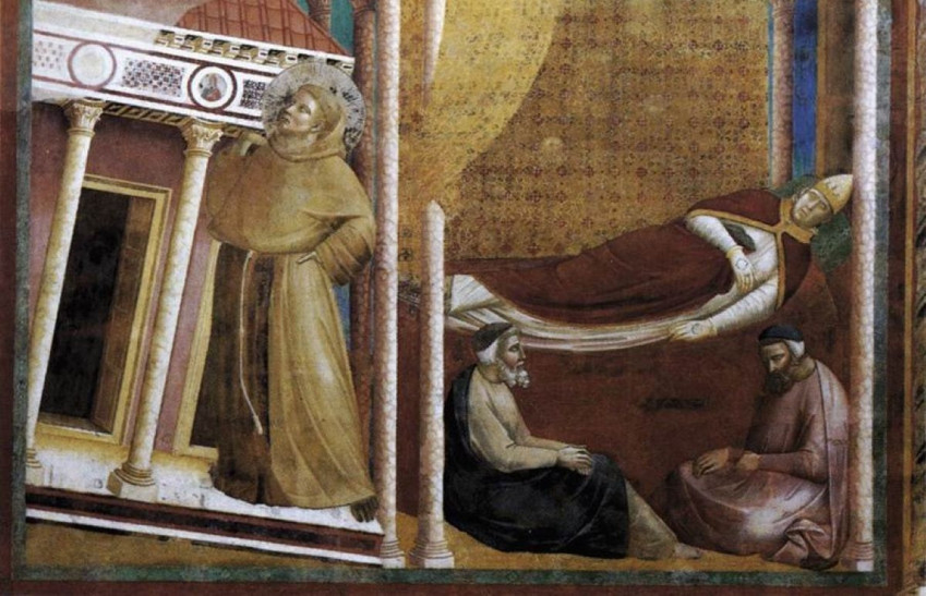 Giotto freskósorozatát ismertető sorozatunk ötödik jelenete III. Ince pápa álmát mutatja be. A történet akkor rajzolódott ki, amikor Ferenc és testvérei a rend növekedésének következtében a pápától kérték életformájuk jóváhagyását. Bár életstílusuk nagyban hasonlított a kor eretnek áramlataira, az Egyházhoz való ragaszkodásuk rendületlen volt. Ekkor Ince pápa álomban kapott jelet afelől, hogy Ferenc lesz az Egyház megújítója és tartóoszlopa.